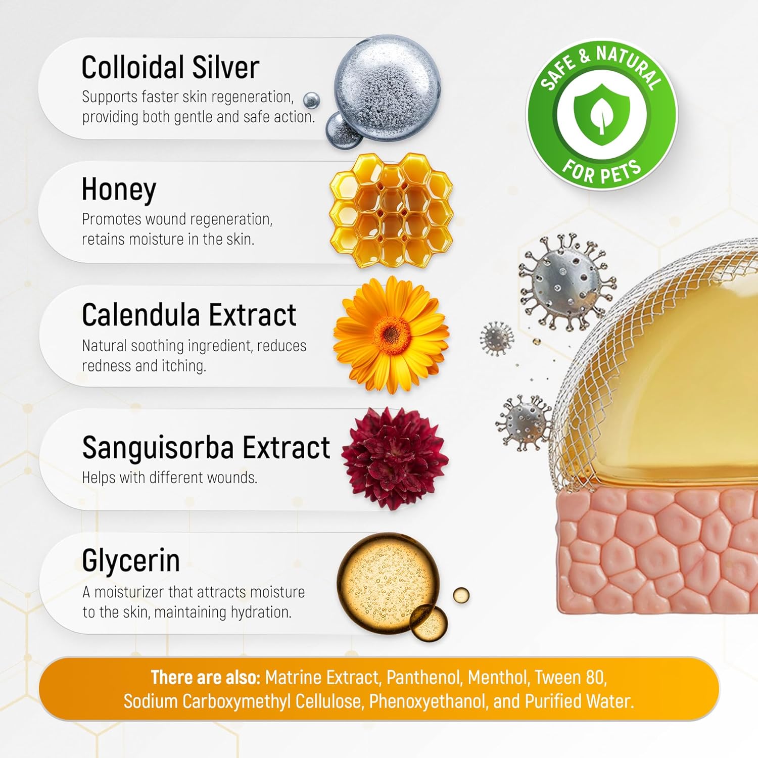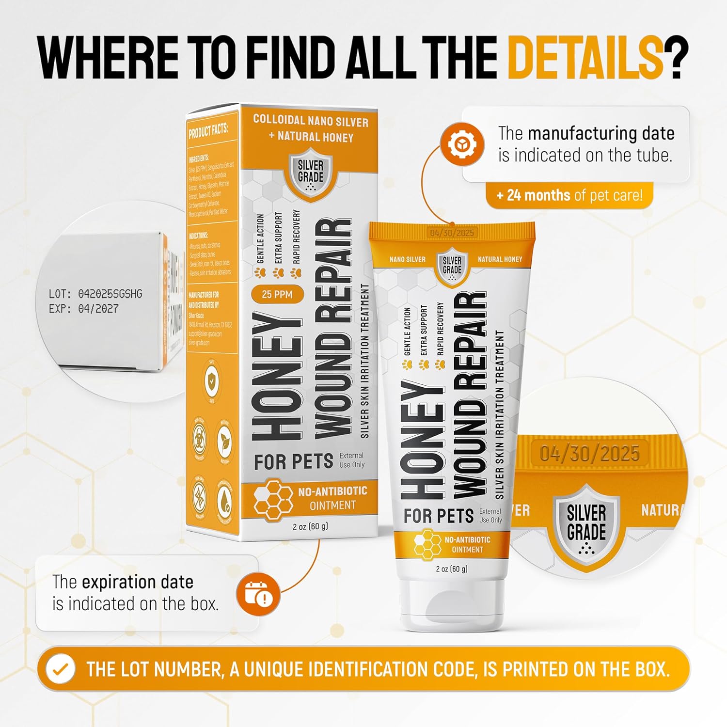 SAFE COMPOSITION – Colloidal Nano Silver, Honey, and other effective ingredients. This cat & dog hot spot treatment has no artificial additives! No antibiotic ointment in gel form! СAT & DOG SKIN IRRITATION TREATMENT – This Honey Wound Repair gel is for wounds, cuts, rashes, scratches, surgical sites, sweet itch, rain rot, bug bites, & sores. FOR BIG & SMALL PETS – Cats, dogs, horses, or others? This cat skin irritation treatment & dog wound care is a perfect solution for all breeds, ages, and sizes! Use a cone for dogs to stop licking! CONVENIENT FORMAT – 2-oz tube format – perfect for travel! Our hot spot treatment for dogs & cats is easy to use at home or on the go. Quick to apply and fast to absorb! PH BALANCED – Our wound care for dogs & cats is formulated to match skin pH. Whether it’s a scratch from play, an itchy hot spot, or dryness on sensitive skin, this gel is a reliable daily helper. USE BEFORE EXPIRY: To ensure the safety of your pets, please review the details. The manufacturing date is indicated on the tube, and the expiration date is indicated on the box. CARING FOR PET PARENTS TOO – If this wound care for cats product arrives damaged, contact us and we’ll help you, because caring for pets means caring for their people, too. › See more product details