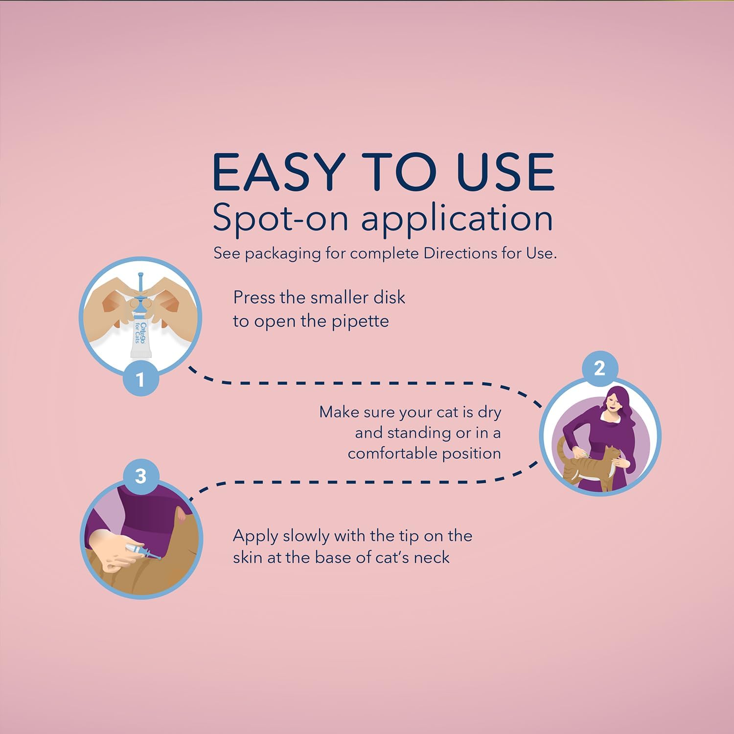 - Directions: HOW TO APPLY 1. Ensure your cat is dry before applying the product, and ensure your cat remains dry for 24 hours after application. The cat should be standing or in a comfortable position for easy application. 2. Remove the tube from the package. 3. Holding the tube upright, pointing away from you and your cat’s face, place your thumb and index finger around the applicator tip above the small disk. With the other hand, grasp the stem of the applicator tip under the large disk. Press down firmly on the small disk until both disks meet, piercing the seal. 4. Part the hair down to the level of the skin and slowly apply the product at the base of the cat or kitten’s head until the tube is completely empty. Avoid superficial application to the cat’s hair. Do not get the product in your cat’s eyes or mouth. 5. Discard the empty tube as outlined in the Storage and Disposal section. 6. Repeat every month. 7. For optimal treatment, control and prevention of adult fleas, flea eggs, flea larvae ticks and chewing lice, year-round monthly application is recommended. Read the package insert for complete product information.