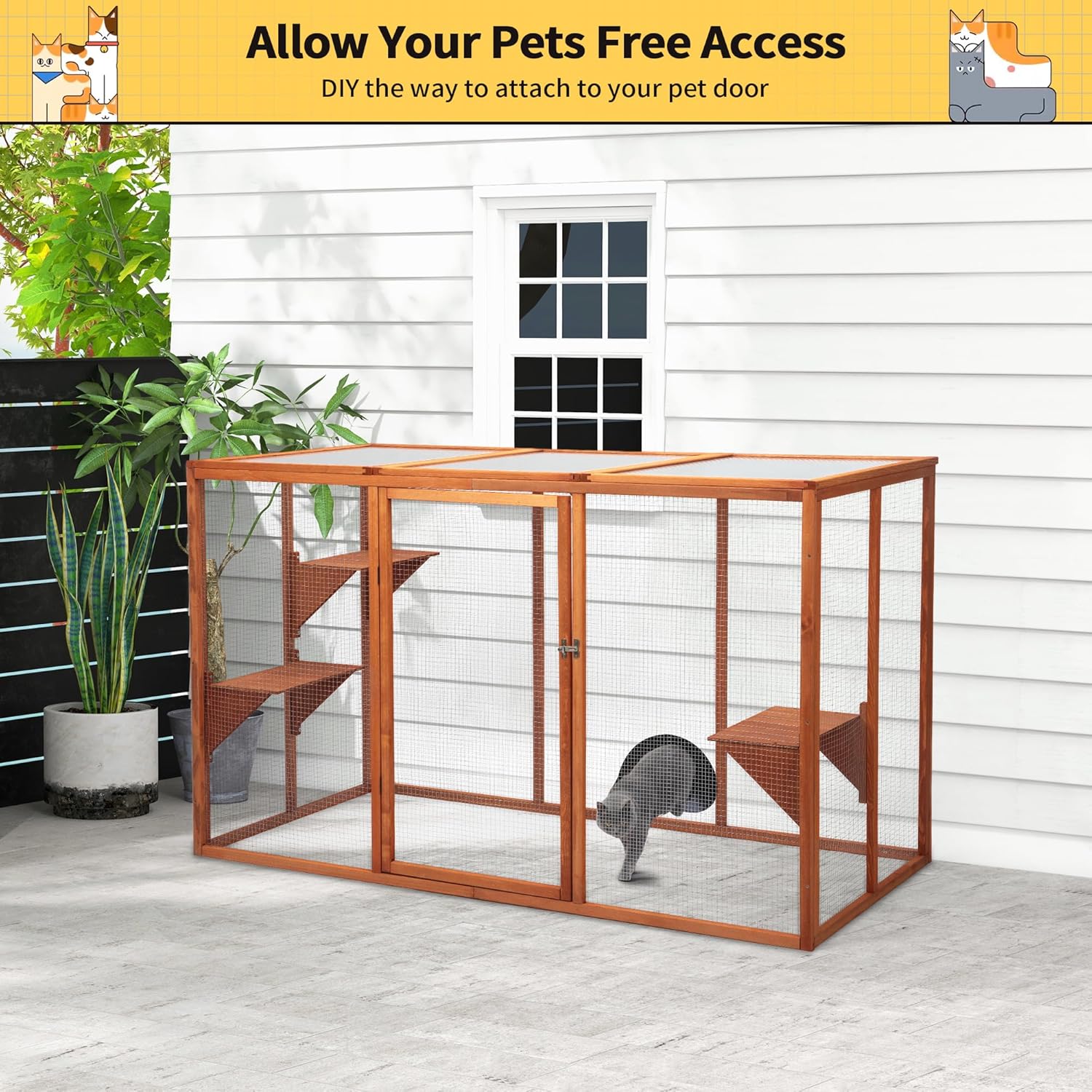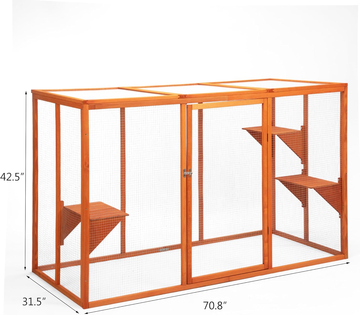 About this item All-Weather Catio Protection: Solid fir wood outdoor cat enclosure structure with 1"x1.5" galvanized mesh, asphalt roof exceeds outside cat house weatherproof standards. 50.7 lbs base stabilizes cat catio in 55mph winds. Wooden Door Security System: 0.6mm predator-proof mesh meets cat outdoor shelter specs. Twist-latch doors protect cat houses for outdoor cats, while ground-level design prevents tripping in cat shelter setups. Long-Lasting Wood & Mesh Combo: Pressure-treated frame for cat condo outdoor durability. Steel corners reinforce cat cage stability, passing 150 lbs load tests on patio enclosure surfaces. Flexible Catio Configuration: 71"×31.5" large cat cage adapts to cat patio spaces. Removable panels convert between permanent catios and mobile playpen modes (balcony/yard ready). Tool-Free Wooden Catio Assembly: Pre-drilled cat enclosure outdoor beams assemble in 20 mins. It includes hardware for a cage for cat upgrades and is compatible with cat condos for patio expansion kits (video guide included). › See more product details