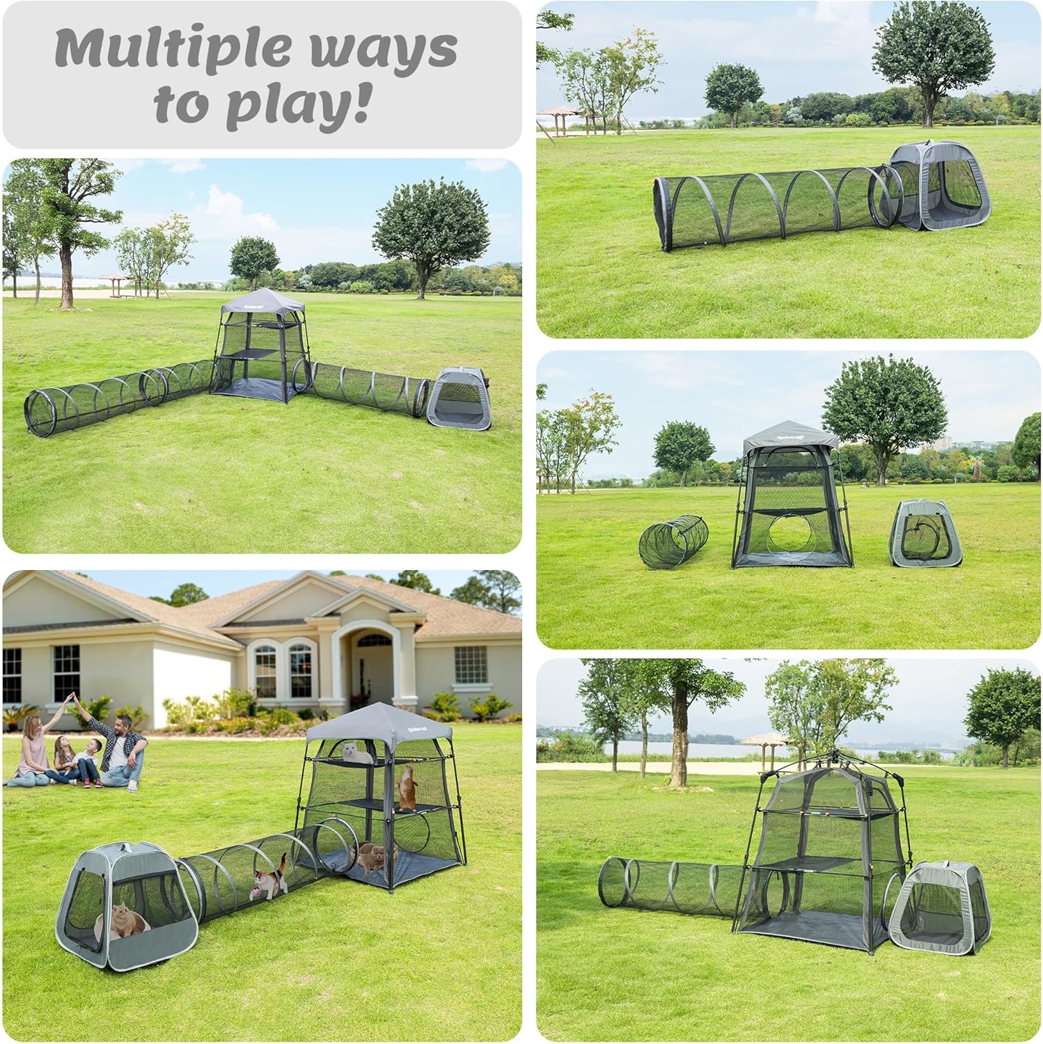 • UNIQUE 3-IN-1 DESIGNQuickup 3in1 Cat Tower Tent Combo includes one Patented tower tent,one cat tunnel and one trapezoid design cat playpen.Multiple ways to play! More fun for your pets!