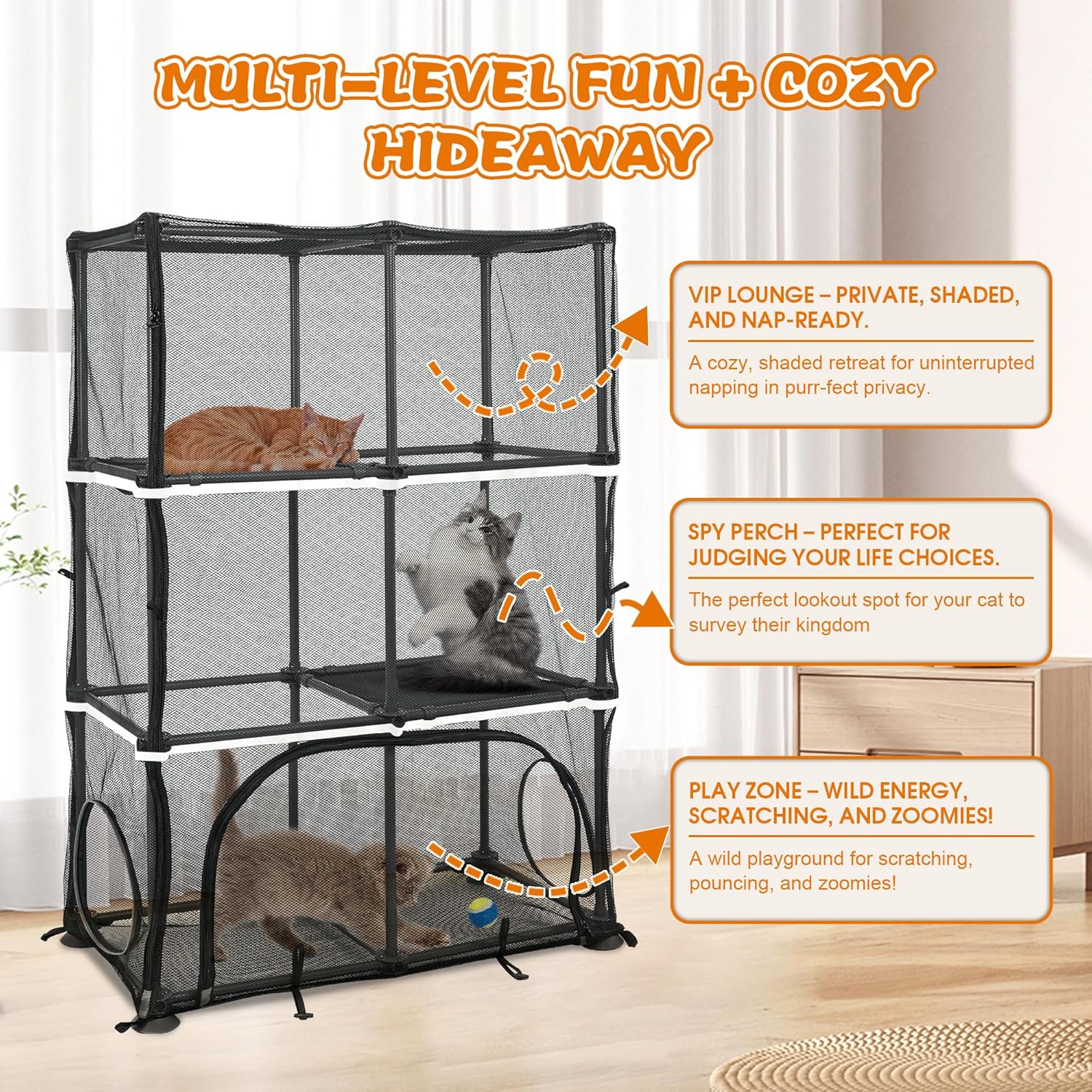 About this item Spacious & Versatile Pet Playground – Give your pets room to roam! This outdoor pet mansion includes a 37”x20”x54” cat tent and a 130” long tunnel, offering plenty of space for cats, rabbits, guinea pigs, and other small pets to play, nap, and explore. Perfect for both indoor and outdoor adventures! Durable & Breathable for All-Day Comfort – Made with high-strength mesh for superior airflow and visibility, keeping pets cool and engaged while protecting them from overheating. The sturdy PVC frame is gentle on paws, and suction cups/ground stakes ensure stability—no tipping, even during energetic play! Multi-Level Fun & Relaxation – Features a 3-tier cat tower with two cozy hanging beds and a removable sunshade for shade on sunny days. The attached tunnel adds extra excitement, encouraging exercise and exploration! Durable & Stable Construction - PetEase Cat House features a sturdy PVC frame with lockable hexagonal connectors for secure assembly. The base is equipped with non-slip suction cups to ensure exceptional stability, supporting up to 25 lbs- perfect for energetic climbing and jumping felines. Requires no tools for quick, hassle-free setup. Ultra-Safe Enclosed Design – The fully escape-proof mesh structure keeps cats securely inside while preventing predators from entering, ensuring safety for kittens, adult cats, and multi-pet households as they enjoy the outdoors. › See more product details