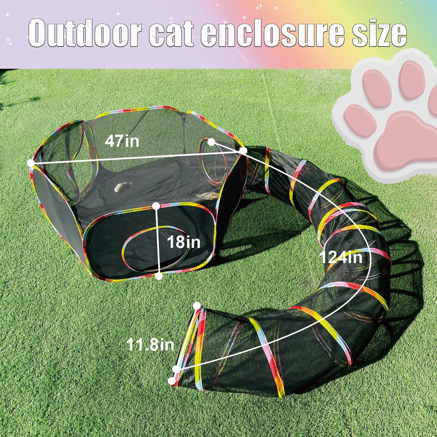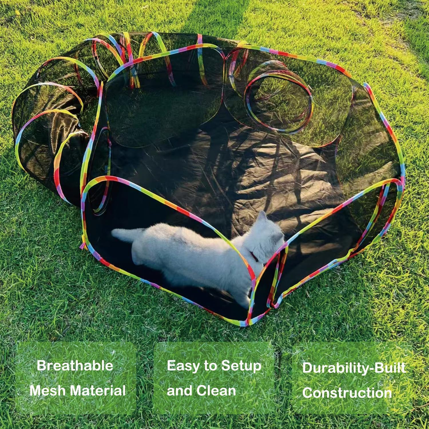 About this item Outdoor Cat Enclosure Set - Includes 1 Cat Tent & 1 Expandable Tunnel, this versatile cat playpen set features a spacious cat tent with two large zippered doors for easy access, along with a connectable tunnel that attaches securely via zipper. The tunnel can be linked to the tent for extended play space or used independently—giving your feline friend endless exploration options. Perfect for your home pet outdoor adventures or indoor fun. Premium Durable Construction – Built to last with 210D waterproof Oxford fabric and reinforced high-density mesh, our enclosure withstands outdoor elements and resists cat scratches while maintaining excellent airflow. The rugged yet breathable materials ensure long-lasting performance for years of safe outdoor enjoyment. Premium Ventilated Design - Expertly crafted from durable Oxford fabric and breathable mesh, our cat enclosure delivers superior comfort and safety for indoor or outdoor use. The innovative construction allows your pets to enjoy fresh air and natural stimulation while giving you clear visibility of their activities. Built to last, it’s the perfect way to keep your cats engaged with the outdoors—safely and securely. Spacious Deluxe Pet Enclosure - Featuring a roomy 47"×47"×18" tent connected to a 12"×124" tunnel, this premium outdoor habitat provides over 15 square feet of play space. Perfect for multiple cats or small pets like rabbits, guinea pigs, and ferrets, the expansive design includes ample room for toys, treats, and even a litter box—ensuring comfort and fun during extended outdoor adventures. Easy Cleanup & Portable Storage - Designed for convenience, the water-resistant Oxford fabric and mesh construction allows for quick cleanup rinse with water. The lightweight design includes a handy storage bag, making it ideal for travel or compact storage. Perfect for any outdoor space—whether in your backyard, on the porch, balcony, or deck. › See more product details