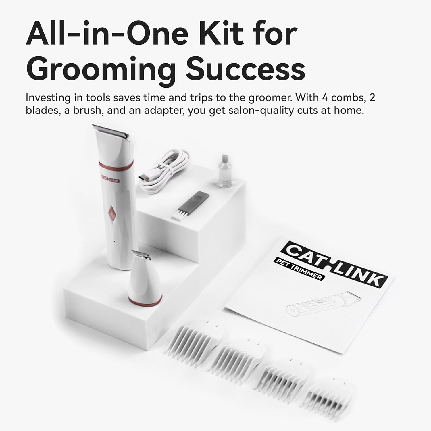 About this item Ultra-Quiet & Trim Fast: No more scared pets although 30% more power! Our<48dB cat hair clippers (quieter than a whisper) ensure stress-free grooming for noise-sensitive cats. Low vibration prevents discomfort—perfect for paws, ears, and delicate areas. Happy pet, relaxed you Beginner-friendly, Pro Results: Tackle mats and thick fur like a pro with our cat clippers. No pulling, no snagging—just smooth, even cuts in a single pass. Whether you're a beginner or a seasoned groomer, this pet hair clipper handles all coat types speeds, giving you total control for precision trimming without frustration Featherlight (4.5oz) Design: Fits like an extension of your hand and design prevents wrist strain, even during long sessions. No more bulky tools—just comfort and control. These cordless cat shaver can easily fit into pockets or travel bags, ideal for beginners and versatile enough for any location Waterproof = 10-second cleanup: IPX7 waterproof cat grooming kit means you can rinse the blade under running water after each use—no tedious disassembly! Bonus: The detachable blade design makes oiling and maintenance All-in-One Kit for Grooming Success: Why buy separate tools? 4 combs, 2 blades, cleaning brush, lubricanting oil and USB cable is value-packed, all for salon-quality cuts at home, saving you time and trips to the groomer › See more product details