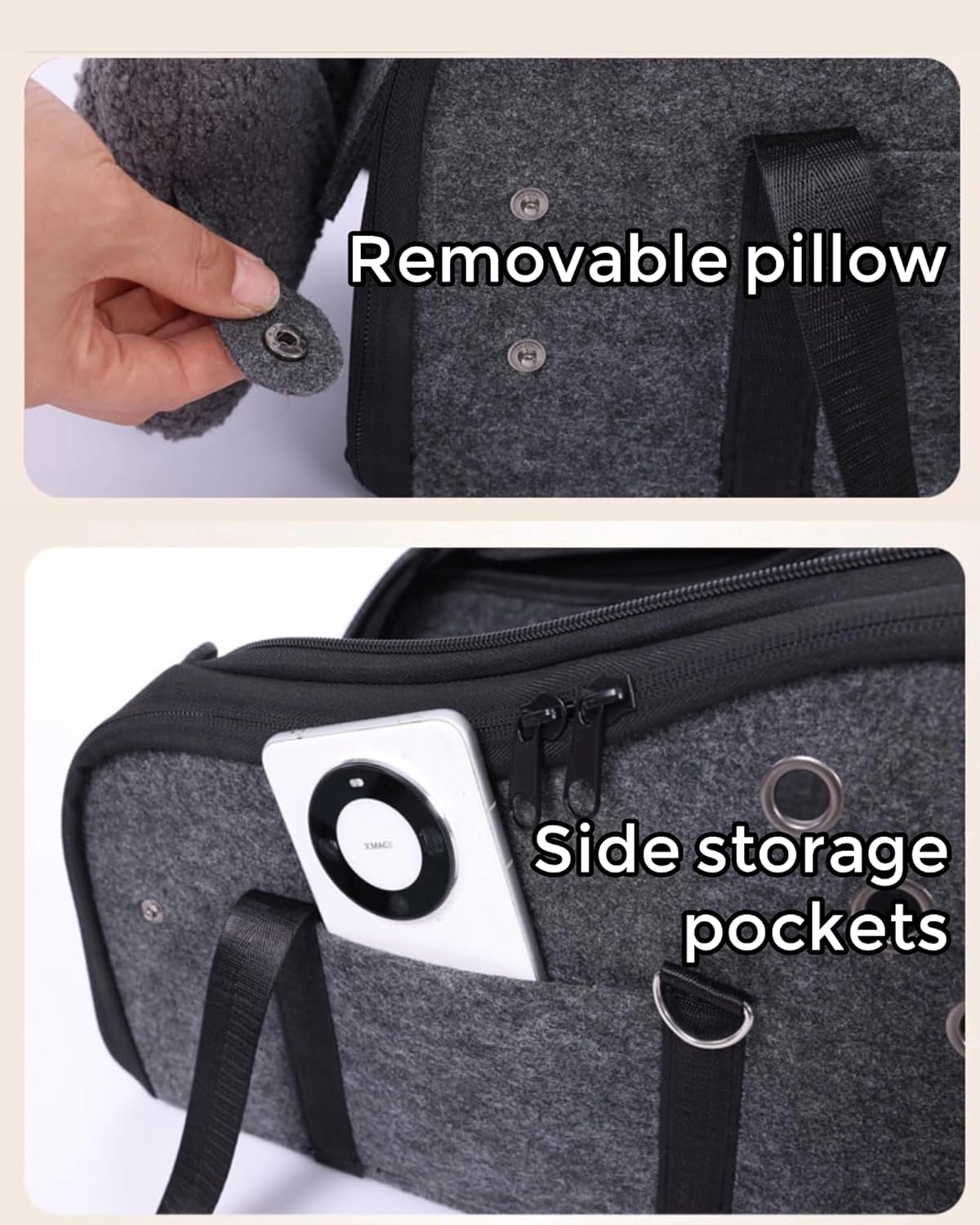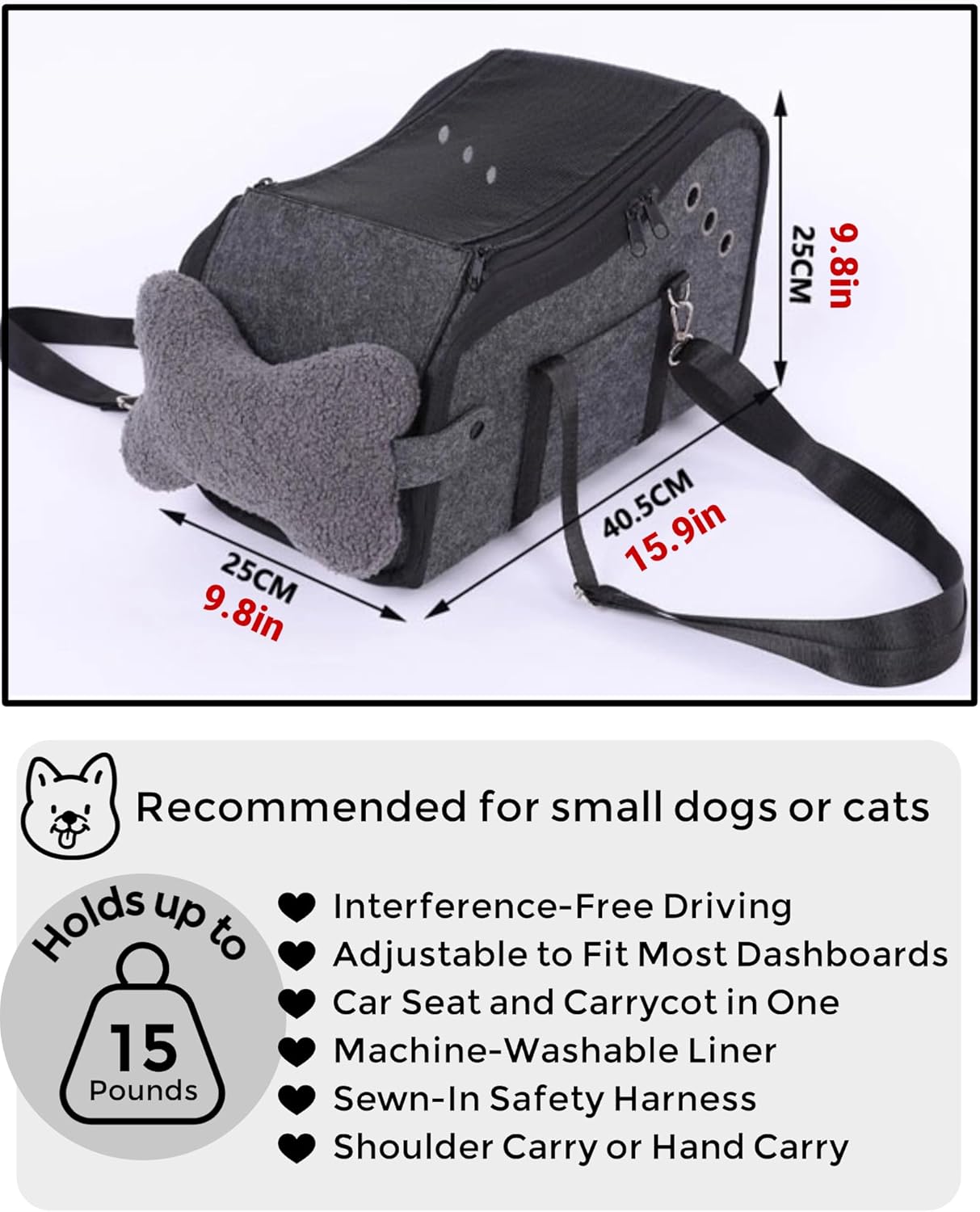 About this item Safe and Secure: This dog center console car safety seat prevents luggage bags from sliding during the ride, ensuring the safety of your beloved dog. The ends of the straps are equipped with metal hooks for quick removal, and can also be used as shoulder straps when not in use Suitable for Small Dogs and Cats: The dog car seat measures 16.9 in L x 9.8 in W x 9.8 in H, designed for small dogs and cats weighing up to 15 lbs, up to 14in length, Small dogs and cats with a width of no more than 7in, to ensure a perfect fit for your furry friend, please measure your pet and console before purchasing Booster Seat: This dog car seat can be mounted on the center console of your car, giving them a good line of sight to see out the window easily. Equipped with a seat belt, this seat ensures your pet stays safe in an emergency while reducing instability during vehicle travel Large Resting Space: Rigid hollow plate material provides support for your pet, rigid support for high safety, lightweight and easy to take your pet out. Two adjustable seatbelt anchors to prevent it from sliding in the car. Side pockets for your pet's food, toys, etc All-Season Dual Effect Cushion: Winter wool pile locks temperature, summer ice silk moisture-conducting and sweat-absorbent, breathable honeycomb mesh design active heat dissipation, adapted to SUV/trucks/cars full model center layout (horizontal/vertical bidirectional compatibility) › See more product details