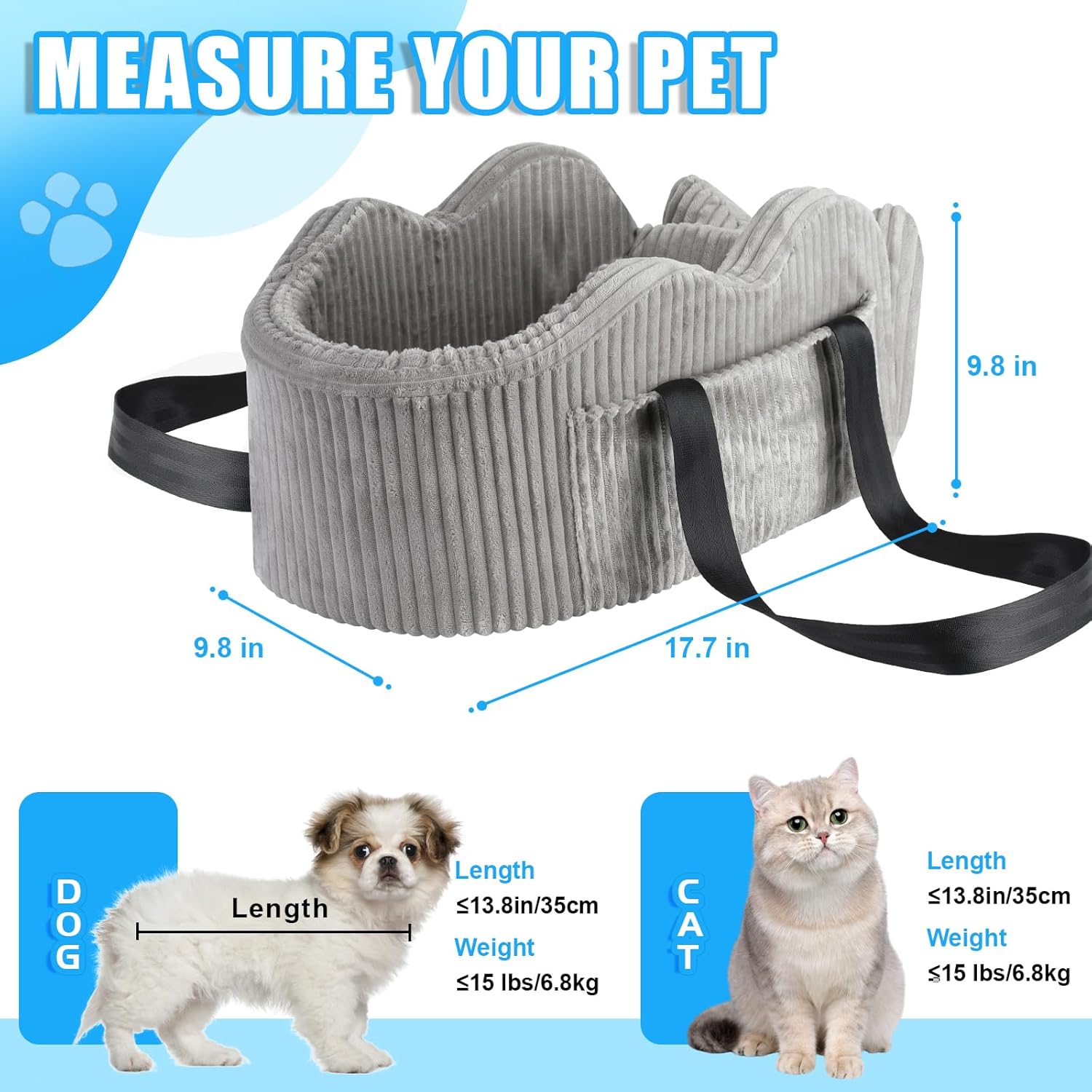 Outstanding Features of the Center Console Dog Car Seat: 1. Safety: There are two Velcro strips at the bottom of the dog car seats for small dogs, which can firmly fix the pet car seat on the center console of the car; there are adjustable seat belts inside to prevent pets from running around during driving 2. Stable Support: The bottom is equipped with a high-density honeycomb board, which is strong and stable, providing a comfortable environment for pets 3. Protect Pets: The sides of the small dog car seat are filled with 3cm thick pearl cotton, which can provide better safety protection for pets during travel 4. Comfort: There is a double-sided cushion at the bottom of the puppy car seat, one side is high-quality flannel, suitable for winter use; the other side is Oxford cloth, suitable for summer use; there is also a bone-shaped headrest in the front so that pets can rest better during travel 5. Suitable for Small Dogs: The size of the car seat for dogs small 5 - 15 lbs is 17.7*9.8*9.8 inches, suitable for kittens or puppies with a back length of less than 15 inches and a weight of less than 15 pounds 6. Multi-Function: In addition to being used as a console dog car seat, this dog booster car seat can also be fixed on the passenger seat or used as a shoulder bag. When traveling with your pet, you only need car seats for dogs like this. 7. Give Your Pet A Better Travel: Installing it on the center console can provide a better view for your pet, relieve your pet's anxiety during the trip, and allow your pet to enjoy the entire trip. Warm Tips: 1. Please measure the length of your pet and the size of the car's center console before purchasing to avoid a situation where it cannot be used due to inappropriate size.