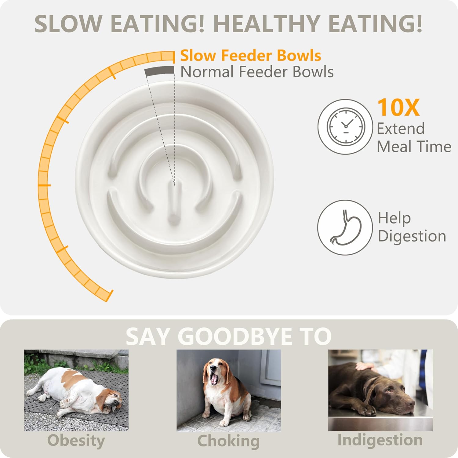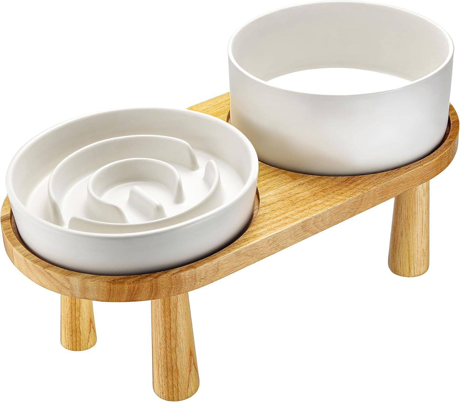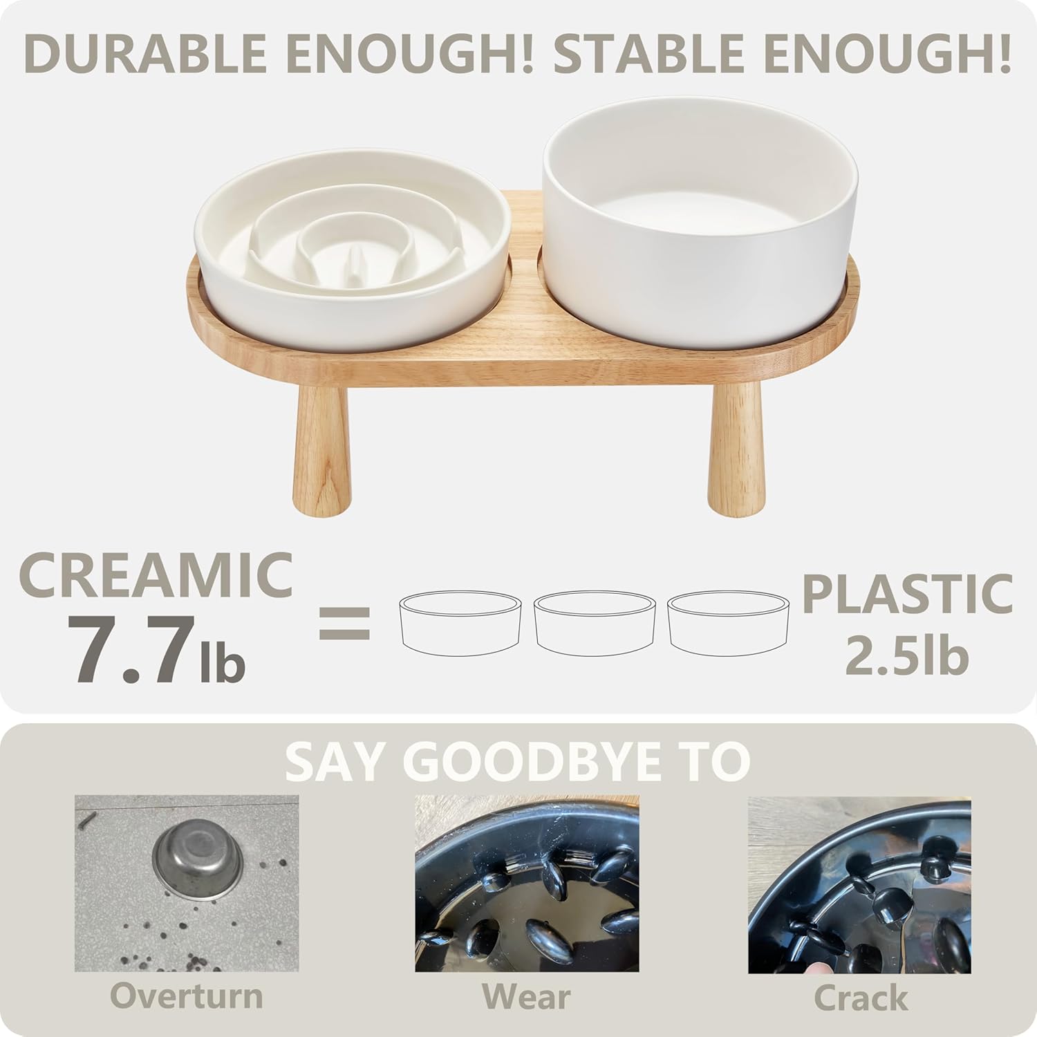About this item 【Safe Sturdy Ceramic Material】Enjoy food safely and healthily — Plastic dog bowls are often bitten by dogs, resulting in the plastic being ingested by dogs, which is harmful to dogs' health. We prioritize your pet's health by using high-quality ceramic for our slow feeder dog bowls. 【Stable Non-Slip Wooden Stand】Stable feeding station for dogs — Our ceramic slow feeder dog bowls feature a sturdier wooden stand, made of 0.8-inch thick oak panels and strong wooden legs. The robust stand ensures a longer lifespan for our slow feeder dog bowls. For pet safety, the connection between the stand and the legs is secured with screws instead of nails, so even if the stand is damaged, it won't harm your pet. 【Neck and Joints Protecting】Easier feeding and protecting the neck — The elevated dog bowls ensure that your pet can eat and drink in a more natural, comfortable position. By maintaining a proper posture, your pet can enjoy their meals without discomfort. Our elevated dog bowls are best for dogs over 20 lbs. 【Slow Eater Bowl】Change your dog's fast and excessive eating behavior — Pets that eat quickly tend to get fat and choke, which can make the dog sick. Our innovative slow feeder dog bowl is meticulously crafted to encourage your dog to eat at a slower pace, extending mealtime by 10 times. 【Easy to Clean】Removable and dishwasher available — Our ceramic dog food bowls are ideal for both dry and wet food, easy to clean and dishwasher safe. The smooth ceramic surface is easy to wipe clean. This makes maintaining a hygienic feeding area simple and hassle-free, ensuring your pet always has a clean dog feeding station for their meals. › See more product details