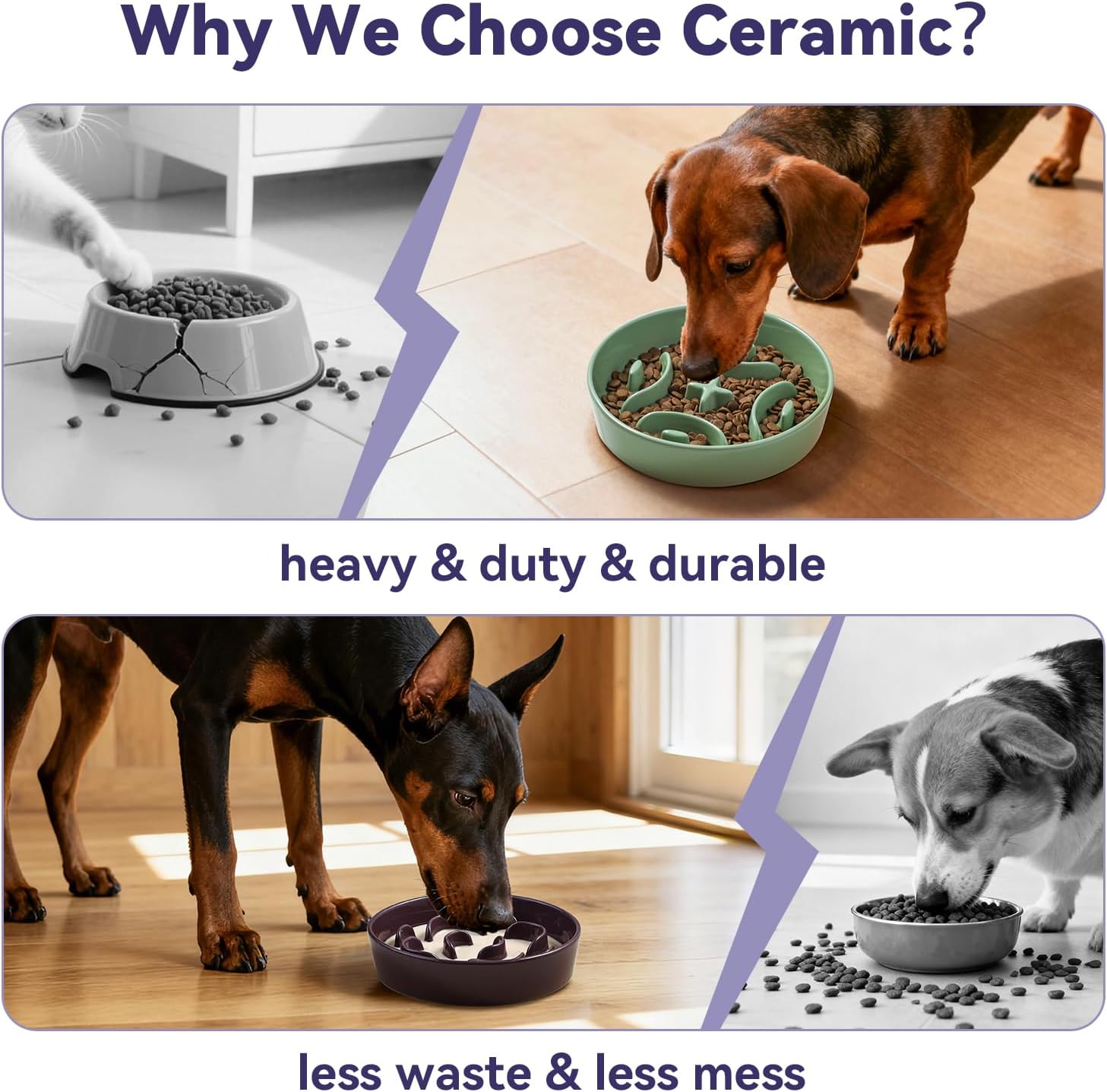 About this item Make Mealtime Healthier & Smarter – Overeating can lead to bloating, vomiting, and obesity. This dog slow feeder is available in two sizes to better match your pet’s needs. S — Suitable for small dogs, holds up to 1.8 cups of food; we recommend 0.8 cups for slow feeding. M — Designed for medium to large dogs, holds up to 3.9 cups; ideal slow-feeding amount is 1.8 cups. Choose the bowl that best suits your pet’s eating habits for a healthier, happier mealtime! Stay-Put Design for a Cleaner Floor - Equipped with non-slip foot pads, these slow feeder dog bowls stay in place during use. Prevents bowls from sliding and food from spilling—great for enthusiastic eaters. Premium Ceramic - Safe, Durable, and Heavy-Duty - Crafted from food-grade ceramic, this slow feeder bowl is lead-free, cadmium-free, and chew-resistant. Heavy-duty weight keeps it stable during use, providing a safer, longer-lasting choice for daily feeding. Versatile Feeding for Every Meal – Perfect for dry, wet, or fresh meals, this ceramic slow feeder dog bowl features six unique maze designs that help your pet eat more slowly and support healthy digestion. Quick Clean, Heat Safe - This slow feeding dog bowl is dishwasher-friendly and microwave-safe . Its smooth surface makes cleaning effortless—just rinse or toss it in the washer. (Tip: 1.Please remove the anti-slip pads before microwaving, as they are not heat-resistant.2.If using wet food, rinse within 10 minutes, a little water helps loosen leftovers for easy clean-up.) › See more product details