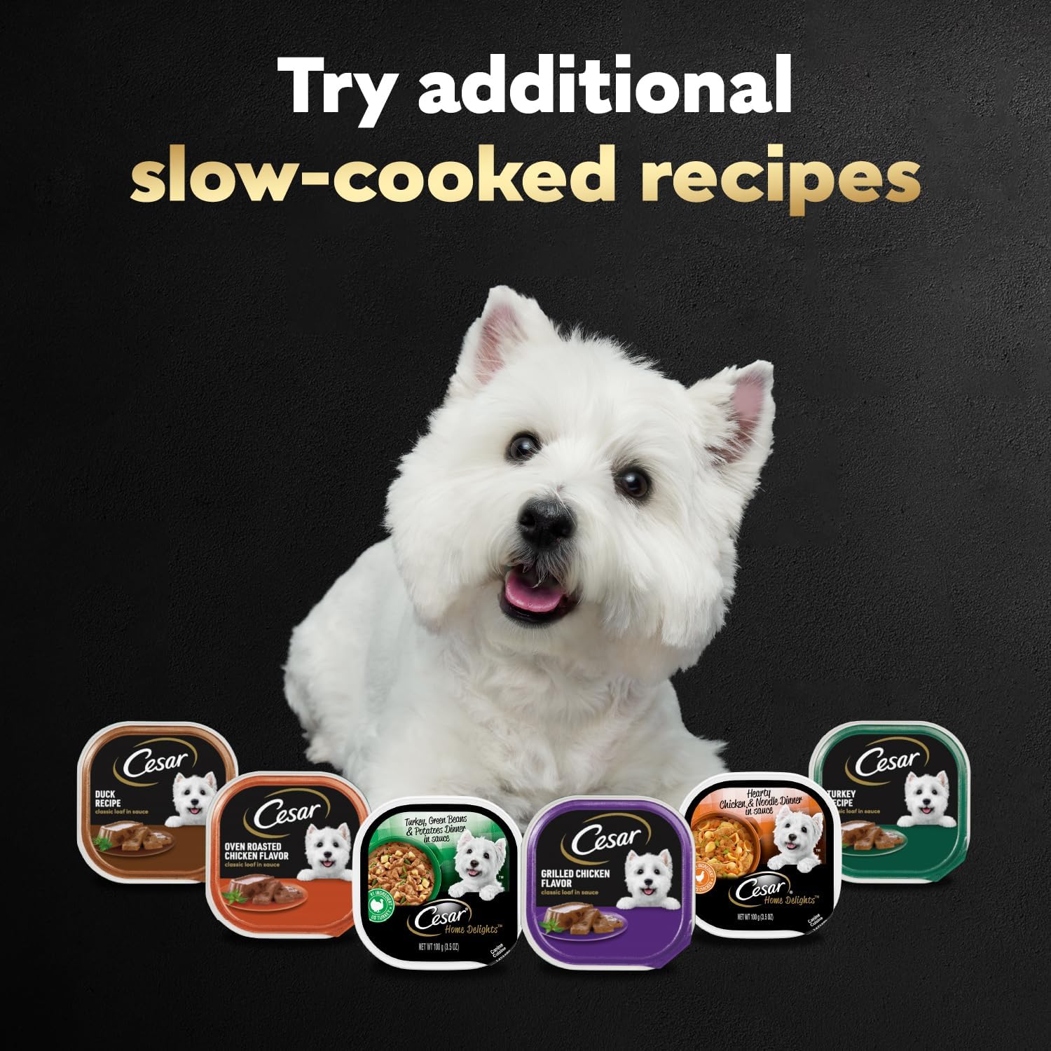 The Cesar brand knows that the best way to show your dog love is by keeping them happy and healthy with gourmet meals. With real meat as the #1 ingredient, Cesar Wet Dog Food Steak Lovers Variety Pack with Real Chicken, Turkey or Duck features high-quality protein, and is slow-cooked for great taste. Each serving is easy to digest, but hard for your dog to resist! Made in the USA with the finest ingredients from around the world, you can be sure your best friend is getting a 100% complete and balanced meal. This product contains no fillers, added sugar, or artificial flavors; ingredients are natural as defined by the Association of American Feed Control Officials (AAFCO). This gourmet soft dog food can complement any dry dog food or can stand alone for a delicious culinary experience. It is also served in convenient trays with easy peel-away seals. Delicious and healthy meals for everyday enjoyment with Cesar Wet Dog Food Steak Lovers Variety Pack.