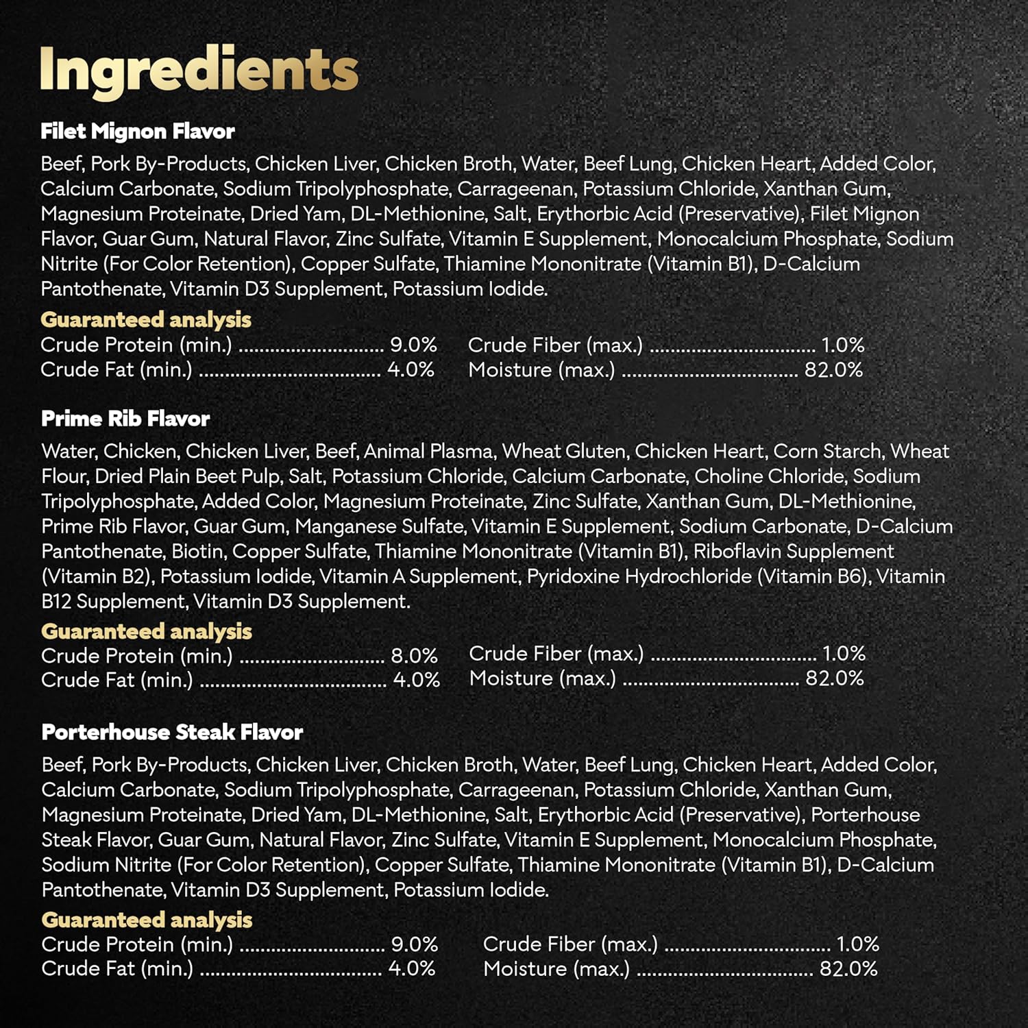 - Directions: Filet Mignon Flavor Feed adult dogs approximately 3 2/3 trays daily per 10 lbs. body weight Porterhouse Steak Flavor Feed adult dogs approximately 3 2/3 trays daily per 10 lbs. body weight Filet Mignon Flavor With Bacon & Potato Feed adult dogs approximately 4 trays daily per 10 lbs. body weight Prime Rib Flavor Feed adult dogs approximately 3 1/2 trays daily per 10 lbs. body weight Grilled Steak & Eggs Flavor Feed adult dogs approximately 3 2/3 trays daily per 10 lbs. body weight Grilled New York Strip Flavor With Vegetables Feed adult dogs approximately 3 2/3 trays daily per 10 lbs. body weight