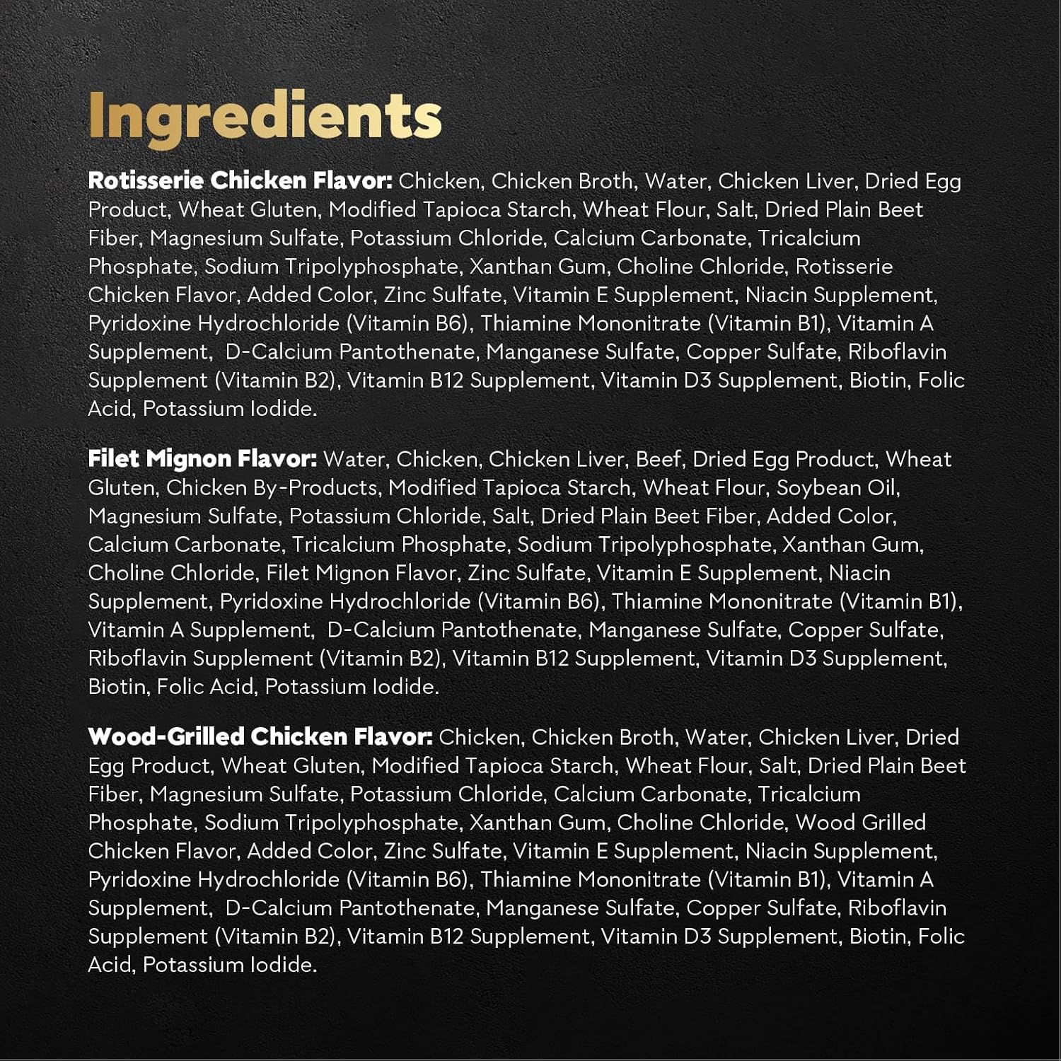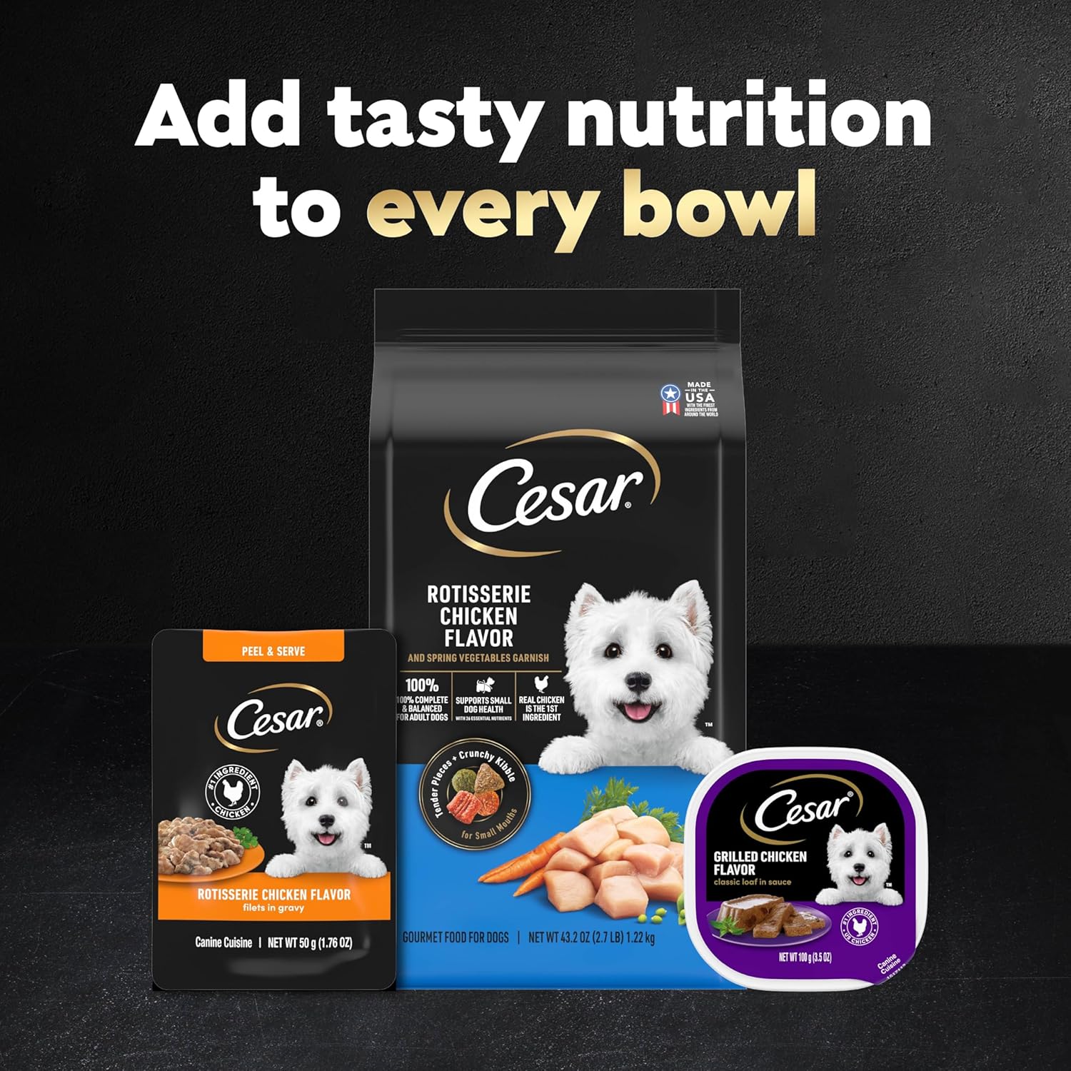 Cesar Filets in Gravy Rotisserie Chicken Flavor, Filet Mignon Flavor, and Wood-Grilled Chicken Flavor Variety Pack brings culinary taste to every bowl. Crafted with real chicken or real beef, Cesar Filets in Gravy wet dog food features high-quality protein and is slow-cooked for great taste. Packaged in mini-pouches with a convenient peel-and-serve seal, this wet dog food is great alone or as a dog food topper. Cesar Filets in Gravy is easy to digest, but hard for your dog to resist! You can be sure your best friend is getting a meal that is 100% complete and balanced for adult dogs. Cesar Filets in Gravy contains no fillers, added sugar, or artificial flavors; ingredients are natural as defined by the Association of American Feed Control Officials (AAFCO). Delicious and healthy meals for everyday enjoyment with Cesar Filets in Gravy Beef and Chicken Flavor Variety Pack.