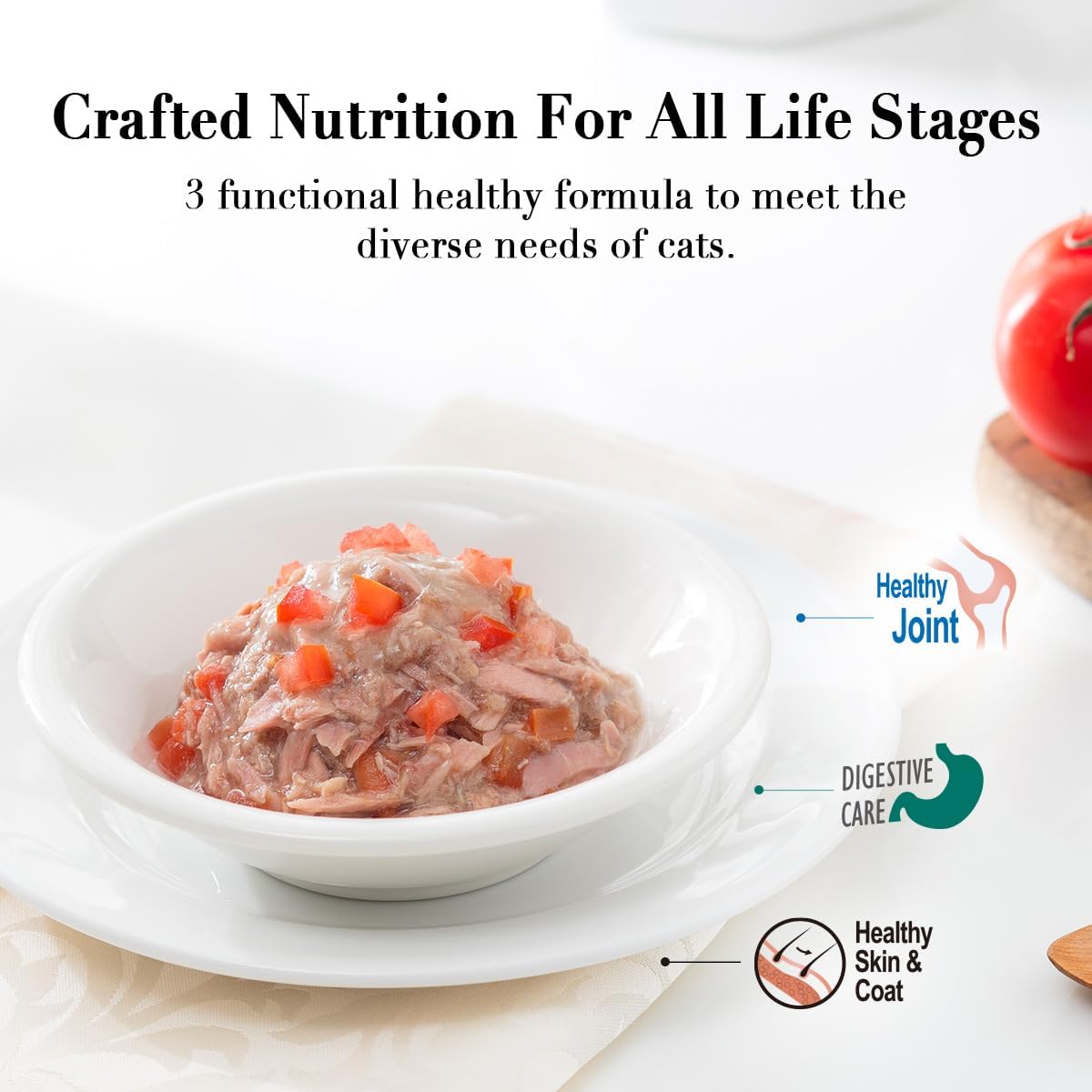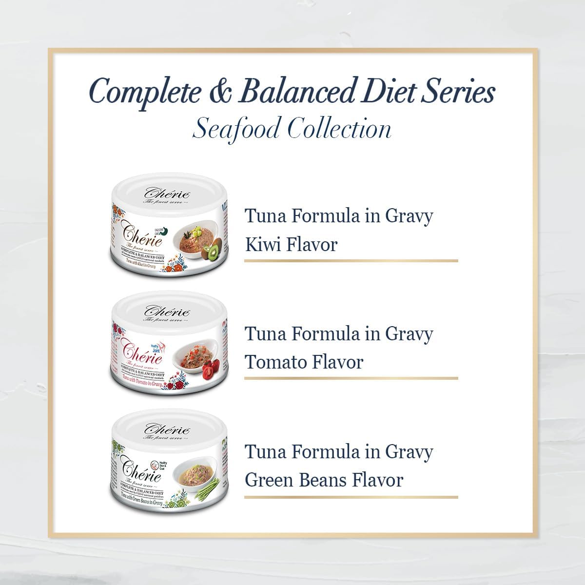 About this item Complete Seafood Functional Variety 24 Cans - The CHÉRIE Complete & Balanced Diet Series includes 24-pack canned wet cat food (2.8 oz each) featuring three functional tuna recipes: Tuna with Green Beans for skin & coat health, Tuna with Tomato for joint support, and Tuna with Kiwi for digestive care. Made with wild-caught fish and premium vegetables, providing high-quality nutrition cats love. Tailored Health Benefits for Total Wellness: Each flavor is enriched with targeted nutrients to meet specific health needs: Omega 3 & 6 to promote shiny fur and healthy skin, Glucosamine Sulfate, Chondroitin Sulfate, and L-Carnitine to support joint flexibility, and FOS prebiotics to aid digestion and gut health. Grain-Free & Gluten-Free for Sensitive Cats - Specially designed for cats with sensitive stomachs or food allergies. Our grain-free and gluten-free mousse reduces the risk of skin irritation and digestive discomfort, while still offering a flavorful and satisfying meal. Perfect for cats requiring a hypoallergenic, wholesome diet without unnecessary fillers or by-products. Kidney & Heart Health Support - Formulated with low phosphorus (under 250mg/100kcal), this recipe is gentle on your cat’s kidneys and cardiovascular system. This gentle formulation supports kidney and urinary tract health, making it suitable for kittens, small cats, senior cats, sensitive stomach cats, or those needing extra care. A worry-free choice for daily feeding. Freshness & Premium Quality Guaranteed - Crafted with wild-caught Tuna and enriched with Nature Vegetables provide natural and essential vitamins to support healthy digestion and overall wellness. The raw materials are cleaned, cooked, and packed within 2 hours to seal in peak freshness and flavor. A healthy, tasty cat wet food that provides hydration, complete nutrition, and targeted health support in every bite. This is one of the key reasons why Cherie is such a tasty food loved by cats. › See more product details