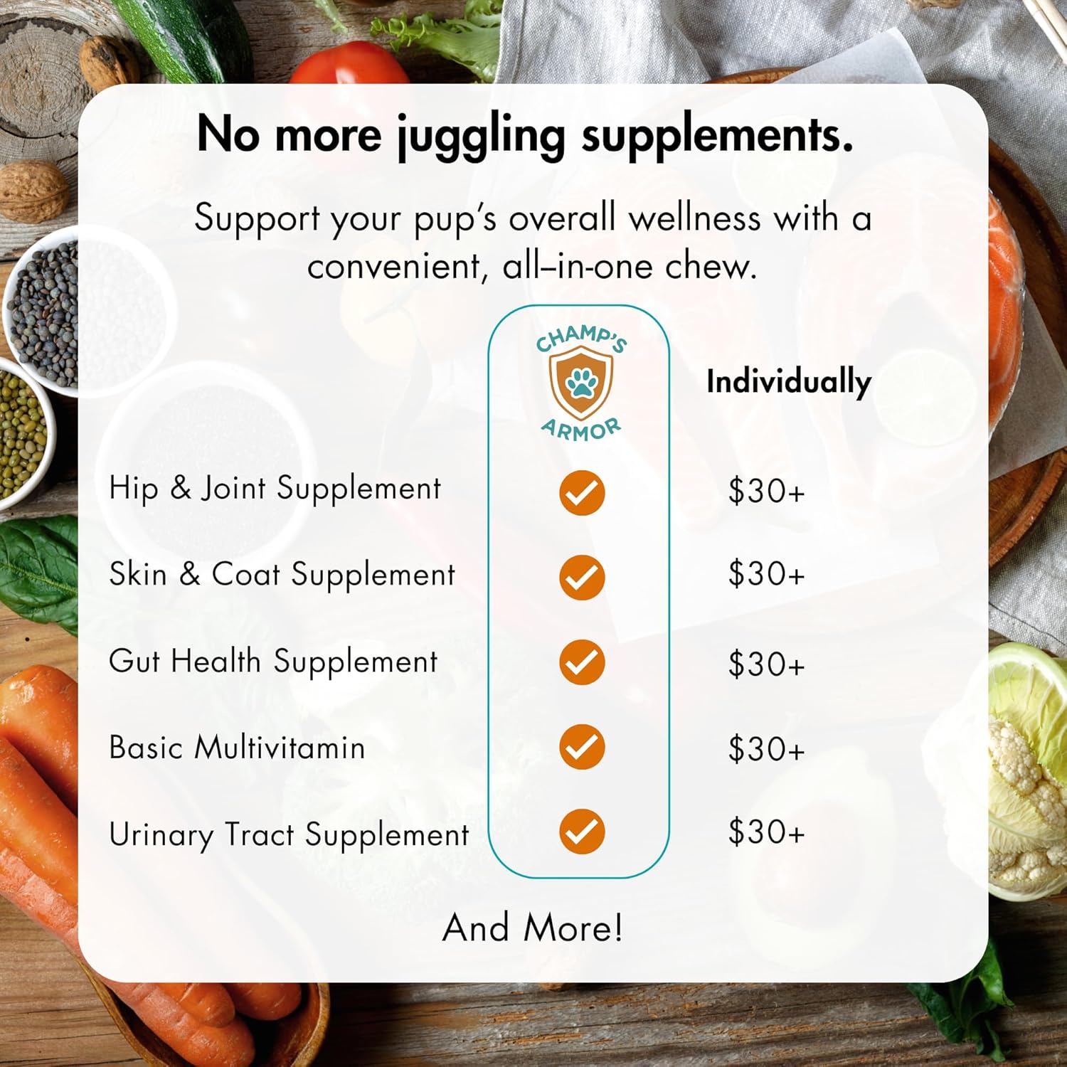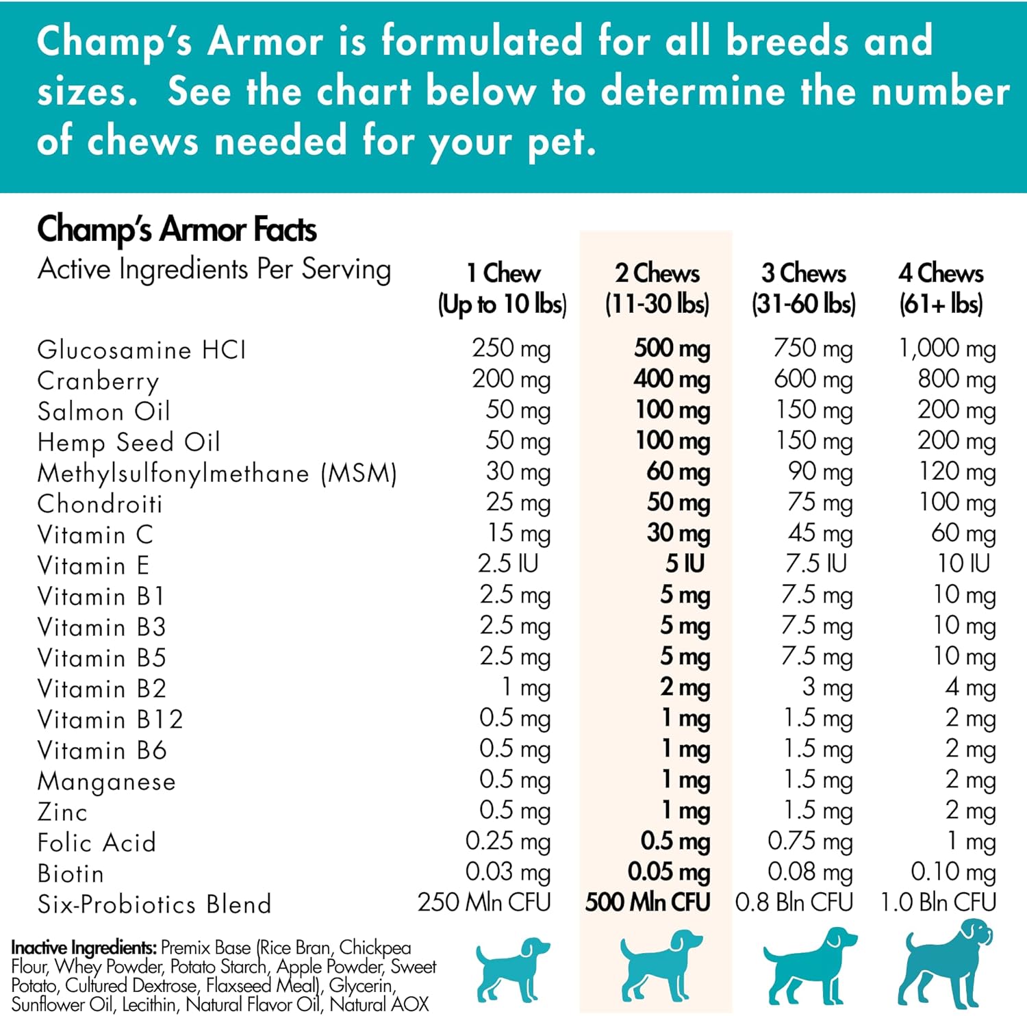 About this item ALL-IN-ONE SUPPORT: Champ’s Armor 10-in-1 Multivitamin is the ultimate all-in-one dog vitamin for the pup who does it all. Packed with support for hips & joints, skin & coat, digestion, heart, immune function, urinary tract, brain, performance, and overall health.* Joint & Mobility Support: Fortified with glucosamine, MSM, and chondroitin — at doses as strong as a dog hip & joint supplement — to help maintain cartilage, reduce stiffness, and keep your dog moving comfortably. Shiny Coat & Healthy Skin: Omega 3 & 6 rich salmon and hemp seed oils combined with biotin and Vitamins E & C reinforce a soft, gleaming coat and healthy skin. Help maintain normal skin moisture and coat comfort Digestive & Immune Fortification: A six-strain probiotic blend balances gut flora and helps with digestion, while vitamins and minerals like B-complex and zinc support immune function and nutrient absorption. Peak Energy & Body Function: Energizing B vitamins, folic acid, and antioxidants help support mental clarity, cardiovascular & liver health, overall vitality, and long-term wellness. Urinary Tract Defense: Cranberry helps prevent bacterial adhesion in the bladder, supporting a healthy urinary tract to keep your pup comfortable and in sync. PERFECT FOR ANY DOG: Champ's Armor is formulated for dogs of all breeds and sizes. Provides complete support for senior dogs and pup alike. TRUSTED QUALITY: Proudly made in a GMP certified facility in the USA. Third party lab tested. Gluten free; no artificial preservatives; no artificial flavoring. › See more product details