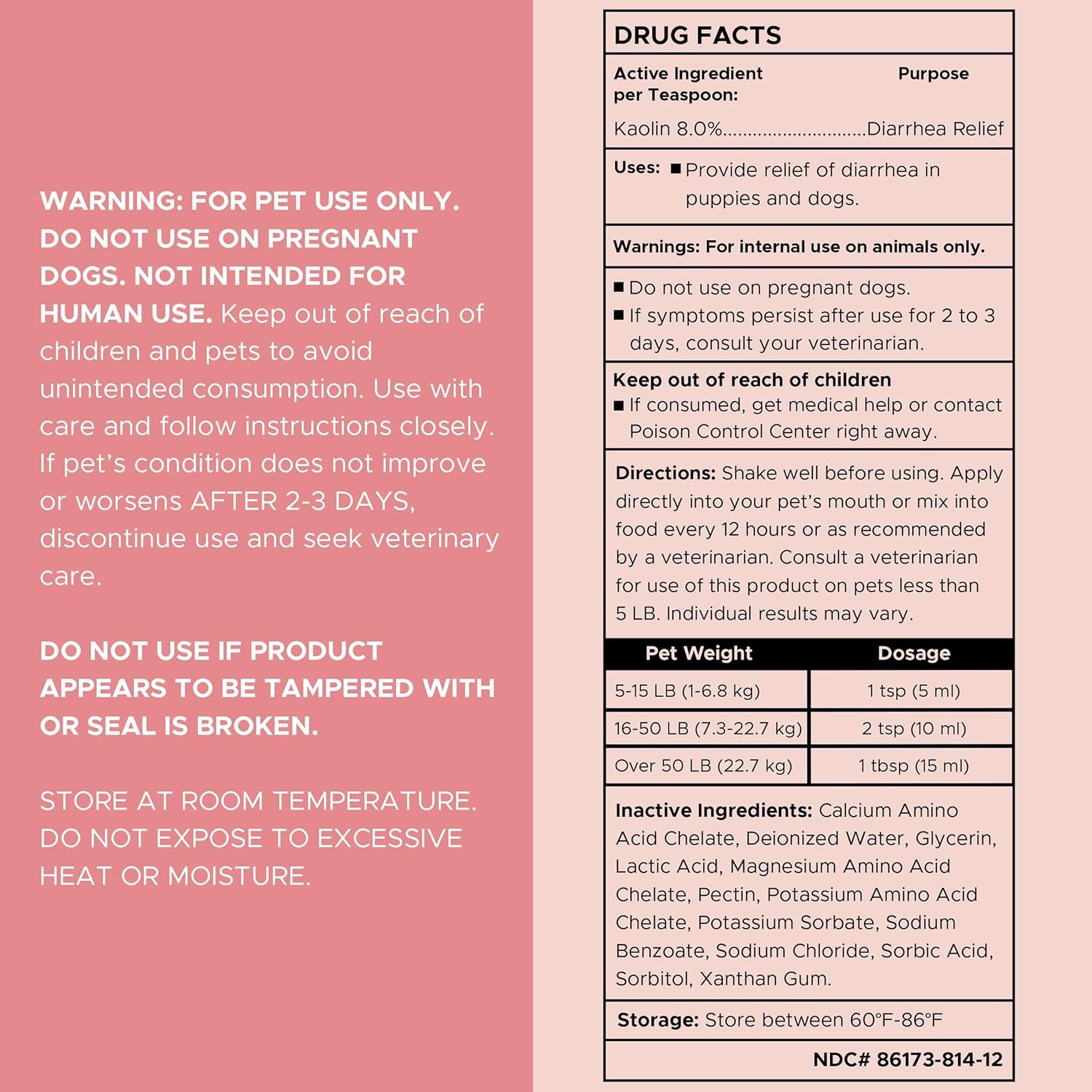 Stop the Diarrhea medicine from Chew + Heal helps to relieve irritation and discomfort caused by diarrhea and an upset stomach. Kaolin helps absorb water to make the stool more firm, reducing diarrhea. It also helps absorb toxins and remove them from the gut. Directions: Shake well before use. Feed directly to your dog or mix into food every 12 hours or as recommended by a veterinarian. For dogs less than 5 lbs., consult your vet. This 2 oz. anti-diarrhea liquid for dogs is good for all breed sizes. Made in the USA. Warning: For pet use only. Do not use it on pregnant dogs. Not intended for human use. › See more product details