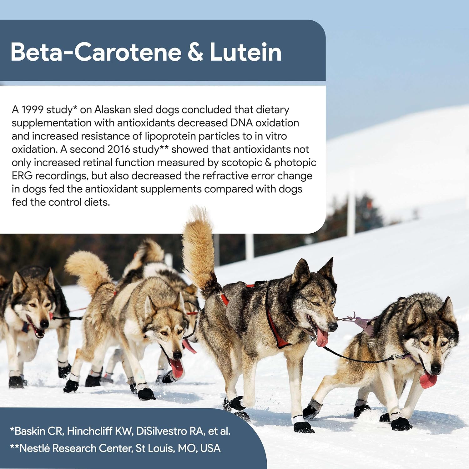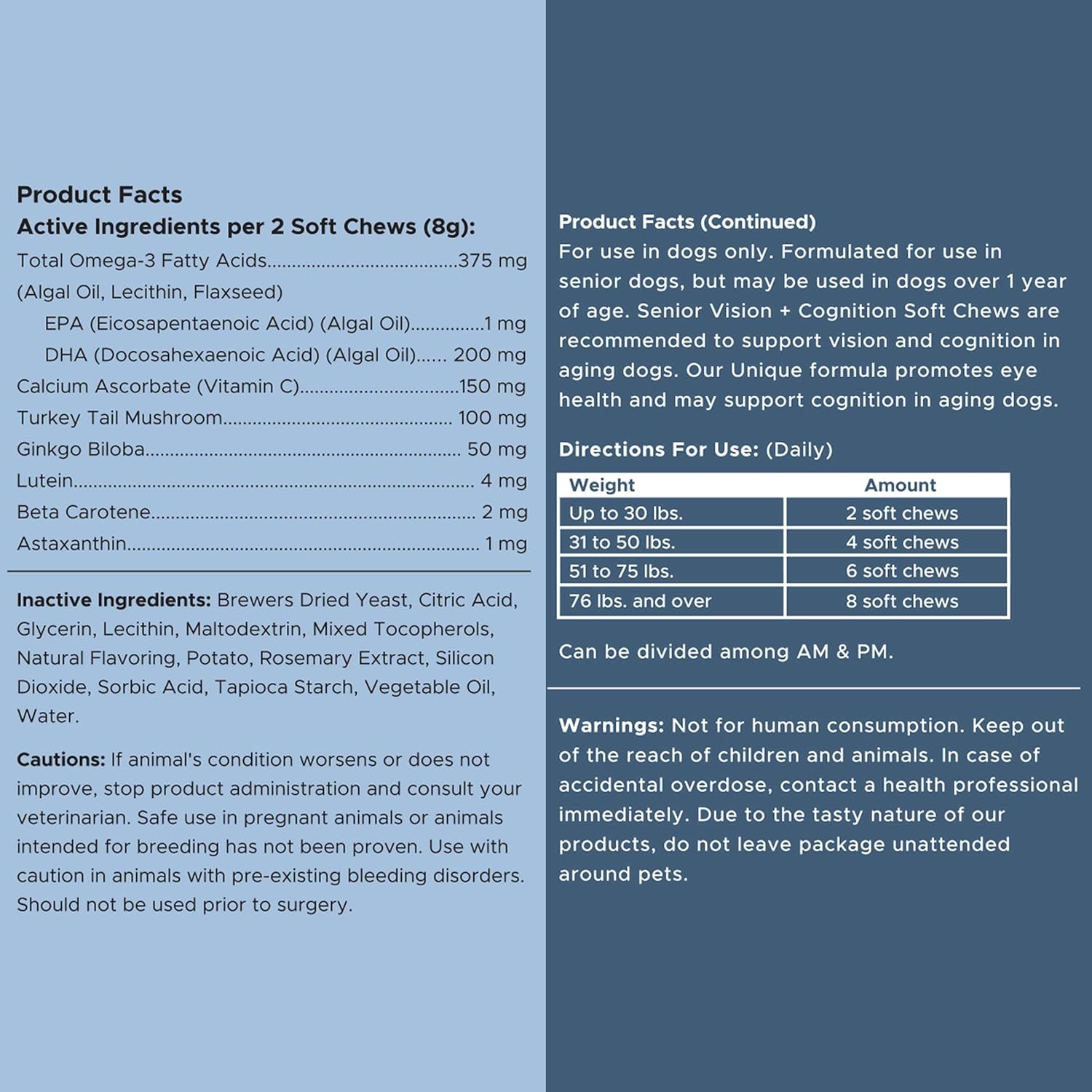 About this item Chew + Heal's eye and cognitive supplement is a dog multivitamin containing natural ingredients to improve eyesight and memory. Our plant-based dog skin and coat supplement is made with algae oil, which is a rich source of EPA and DHA, two forms of omega-3 fatty acids that support retinal and cognitive function, as well as skin and coat health. Vitamin C and turkey tail mushroom contain antioxidants that can also help lower inflammation, which can support vision and cognitive health, while ginkgo biloba supports brain health and memory. These vision bites for dogs contain beta carotene converts to vitamin A, which is good for eye health. Lutein and astaxanthin are both antioxidants that can protect eyes from oxidative stress, which can improve vision and support retinal lens health. Instead of cataract eye drops for dogs that may be hard to administer, try our vision and cognition soft chews. They're easy for senior dogs to chew and are a fun way for your dog to get the support he needs. This dog vitamin and supplement comes with 60 soft chews per bottle. Good for dogs of all sizes and breeds. See the package for serving recommendations. Made in the USA. βΊ See more product details