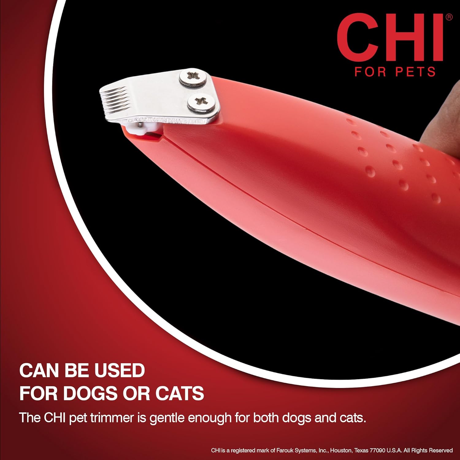 The CHI for Pets Small Area Pet Hair Trimmer is perfect for spot trimming on pet paws, face and ears. This convenient and compact pet hair trimmer utilizes an extra small blade for sensitive and hard-to-reach areas on pets. It is small enough and gentle enough for both dogs and cats, as well as for breeds of all types. For short or long-haired pets, as well as thin to thick and curly pet fur, this trimmer is designed to navigate hard-to-reach areas on all pet hair types. No external batteries are required, simply plug in the USB recharging cord between uses. CHI For Dogs provides luxurious grooming formulas and convenient, pet-safe grooming tools designed for optimal care for your dog's coat and skin. Developed with the same superior technologies as in our professional salon CHI human lines, CHI for dogs brings luxury pet grooming solutions to the comfort of your own home. Directions for use: 1. Bathe, dry, and brush your pet prior to trimming for best results. If your pet’s fur is matted, consult a professional groomer so as to avoid injury. 2. Before each use, apply a few drops of oil along every few teeth of the blades. Use only manufacturer oil intended for this product. 3. Slide the power switch to the ON position. 4. Position clipper blade flat against pet’s body and gently guide along fur. Tilting the blade perpendicular to skin increases risk of injury. Cautions: Product is intended for use on pets only. Never leave a pet unattended on an elevated surface, such as a grooming table. Do not immerse product in water.