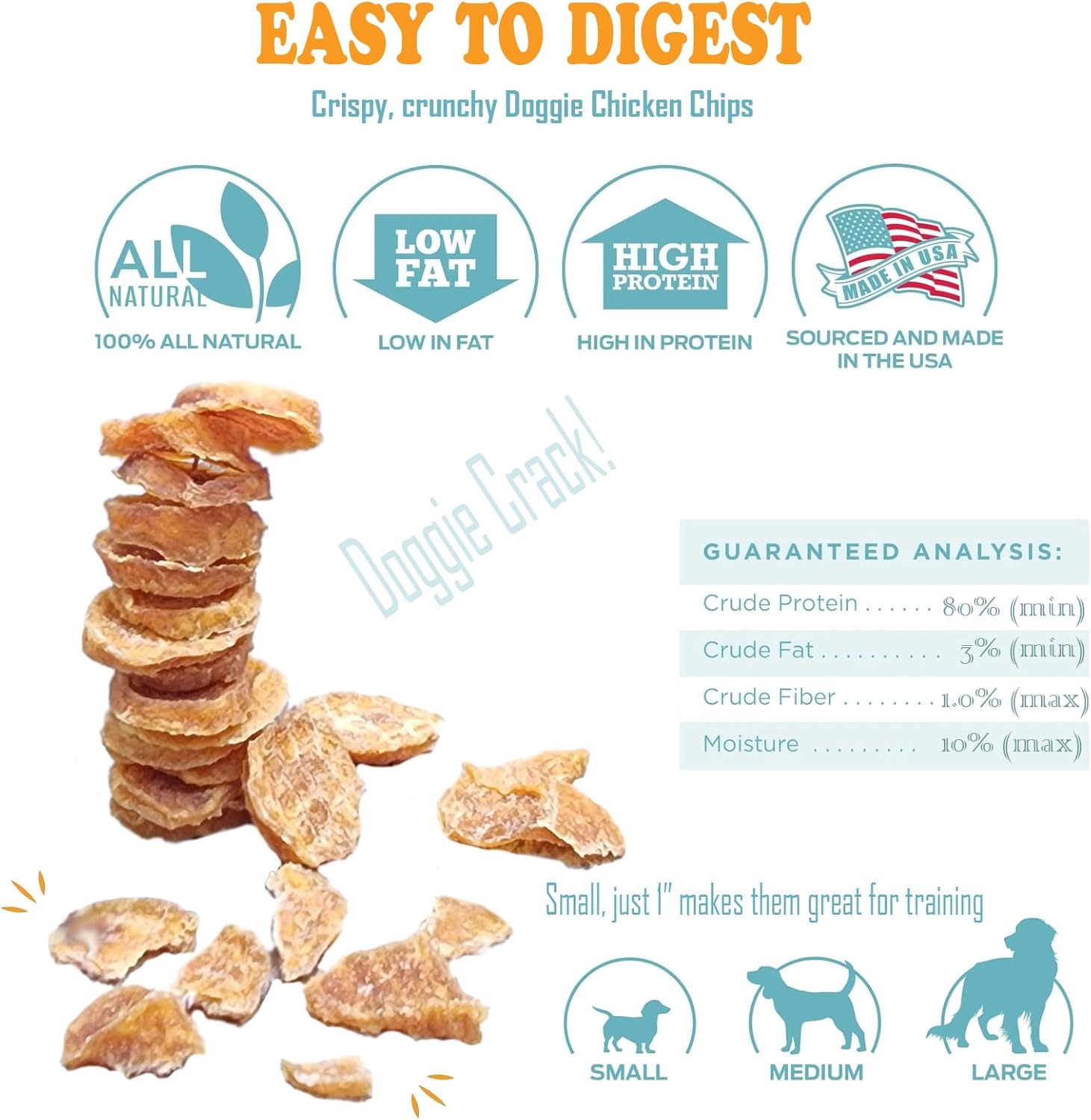 About this item TASTY FLAVOR | WON'T STAIN CARPET | TASTY CHEWS | EASY TO DIGEST | CRISPY & CRUNCHY DOGGIE CHICKEN CHIPS | 1" TREAT SIZE IS IDEAL 4 DOG TRAINING, ESPECIALLY PUPPIES | 114g (4.0 OZ) REAEALABLE POUCH DEHYDRATED TO LOCK-IN FLAVOR: Chicken Chips are made only from 100% USDA boneless white chicken breast. All visible fat is removed. Doggie Chicken Chips are single-ingredient, all-natural treats made with the finest quality chicken breast. Crispy, crunchy Doggie Chicken Chips are dehydrated to lock-in flavor and break apart easily which makes them great for training. Available in convenient 6oz resealable bags. DESIGNED WITH A CRISPY TEXTURE: ALL PETS DESERVE a tasty little treat every now and then. We’re introducing dehydrated 1-in round chips ‘Just Chicken Chips’ to suit the dietary needs and preferences of dogs of all sizes and breeds. A 1" treat size is ideal for dog training, especially for puppies and smaller breeds, because it allows for frequent rewards during a session without adding too many extra calories. The best 1" training treats are soft, chewy, and highly motivating for your dog. IDEAL WEIGHT LOSS SNACK: For dogs on a diet, these chicken apple flavor chips are the perfect companion. They are high in protein and low in fat, making them an ideal snack that aids in weight management without compromising on taste. FREE from any additives, preservatives, fillers, or grains, this protein-packed pet snack makes a great motivational treat for training, a phenomenal food for picky eaters, and of course, a luxurious little reward for whenever your companion is being an extra good boy or girl. GENTLE FOR SENSITIVE STOMACHES: We understand that not all dogs have the same dietary needs. That's why our chicken flavor chips are gluten-free and grain-free, ensuring they are gentle on sensitive stomachs and easily digestible. A treat that's safe and satisfying for dogs with special dietary requirements › See more product details