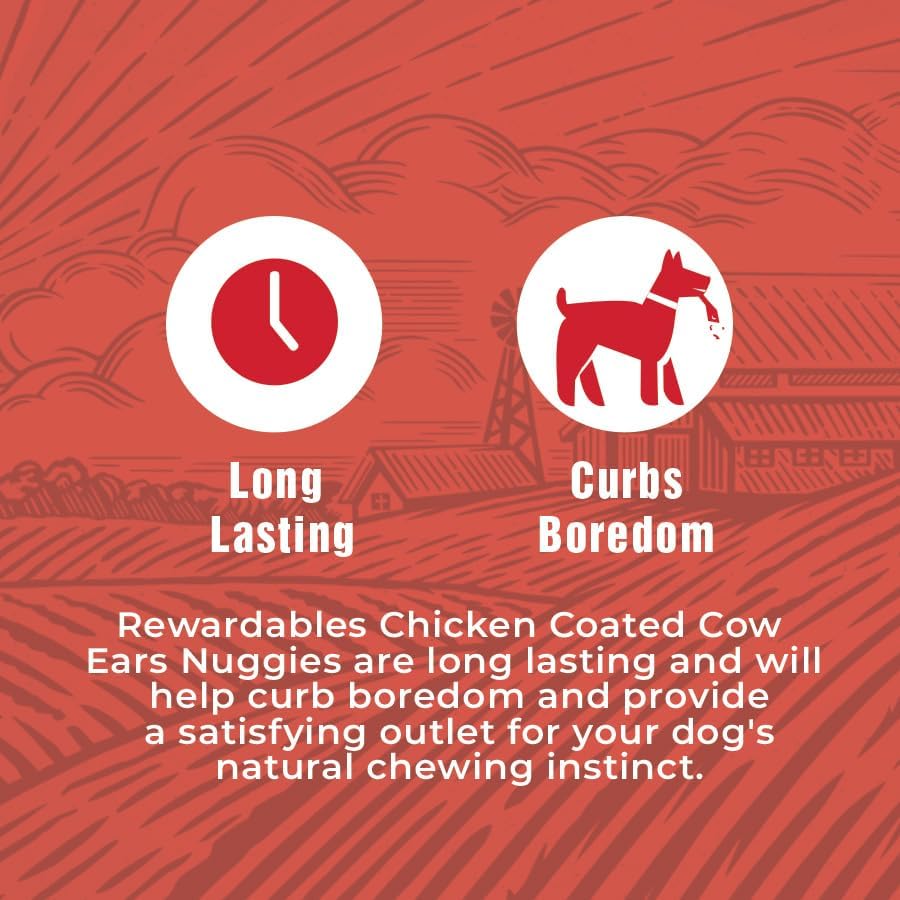 Rewardables Healthy Chewers Chicken Coated Cow Ear Nuggies are the ideal chew for moderate to aggressive chewers. These long lasting, delicious chews are made with out artificial flavors and colors, ensuring a safe and healthy reward for your dog. Each Nuggie is also coated in a delicious chicken coating that will keep your dog barking for more. Always supervise pets with chews and keep fresh water readily available.