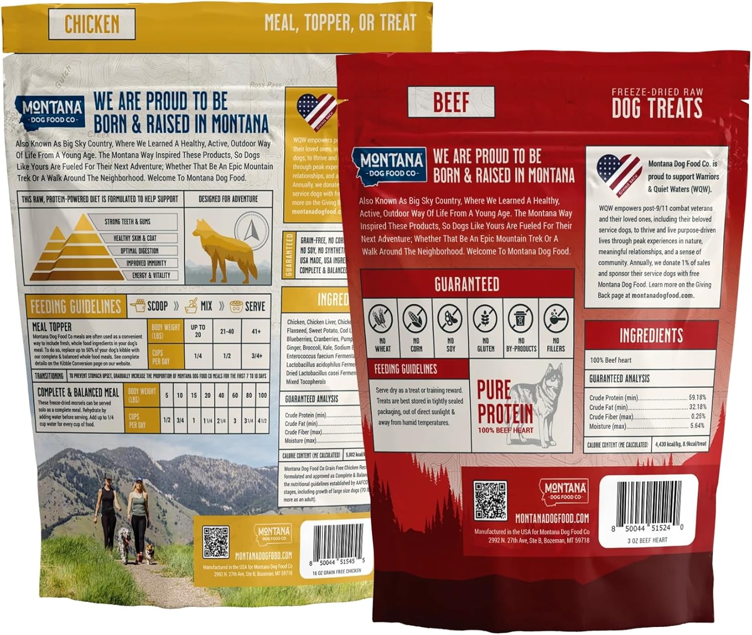 This Montana Dog Food Co. bundle includes our Chicken Freeze-Dried Raw Dog Food (16 oz) paired with single-ingredient Beef Training Snacks. Crafted with USA-sourced ingredients, this convenient bundle provides complete nutrition and healthy, protein-packed treats perfect for training, rewarding, or everyday feeding.