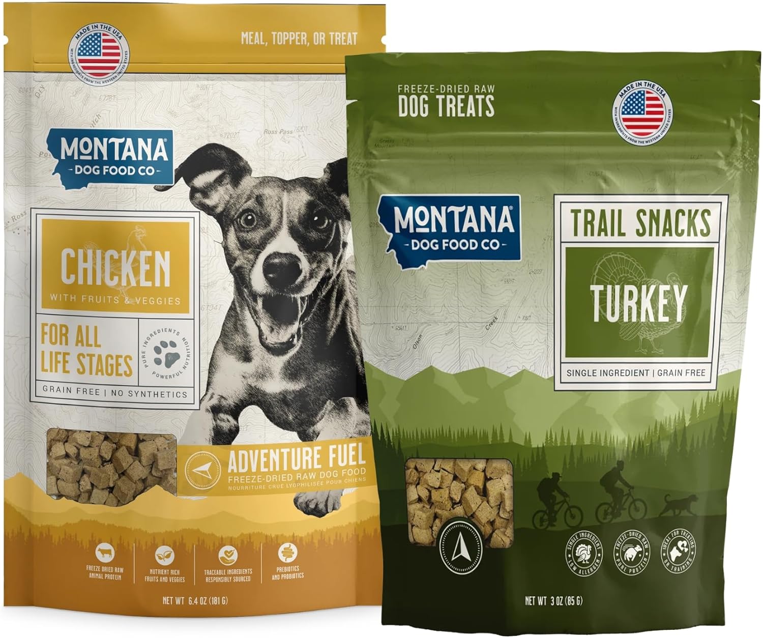 This Montana Dog Food Co. bundle includes our Chicken Freeze-Dried Raw Dog Food (6.4 oz) paired with single-ingredient Turkey Training Snacks. Crafted with USA-sourced ingredients, this convenient bundle provides complete nutrition and healthy, protein-packed treats perfect for training, rewarding, or everyday feeding.