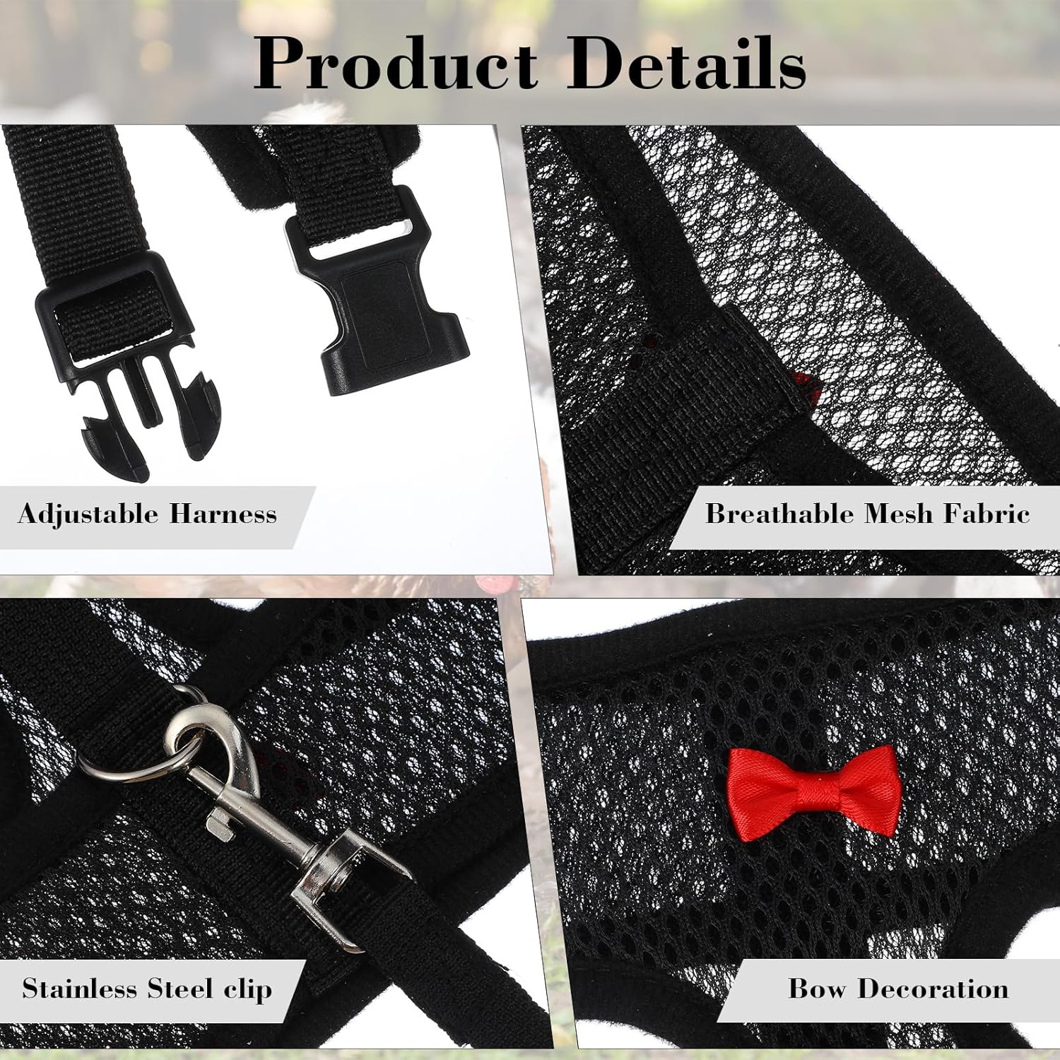 Features:Introducing the Adjustable Chicken Harness and Leash Set, designed to provide your pet friend with a comfortable and stylish wearing experience. Ensure your pet is comfortable in any season.The bow-decorated design adds a touch of cuteness to the entire chicken harness, and the bright black color adds a touch of charm, making your pet the center of attention wherever you go.Whether you are training your pet or just enjoying a leisurely walk, this chicken harness and leash set is the ideal accessory for your small pet. Its adjustable function and durable construction make it a reliable choice for pet owners who pursue quality and functionality.This stylish and practical chicken harness will enhance your pet's outdoor experience!Specifications:Color: BlackMaterial: 90% Polyester + 10% MetalSize: ±2 Cm ErrorNeck Length: 34cm/13.4inchChest Length:34-48cm/13.4-18.9inchRope: 114*1.6cm/44.88*0.63inchPacking List:1 Set Pet Chicken Harness with Leash (Black)Note:1. Please check if it is the size you need before purchasing.2. Please allow slight differences due to manual measurement.3. Due to light and screen difference, the item color may be slightly different from the pictures. Please understand.