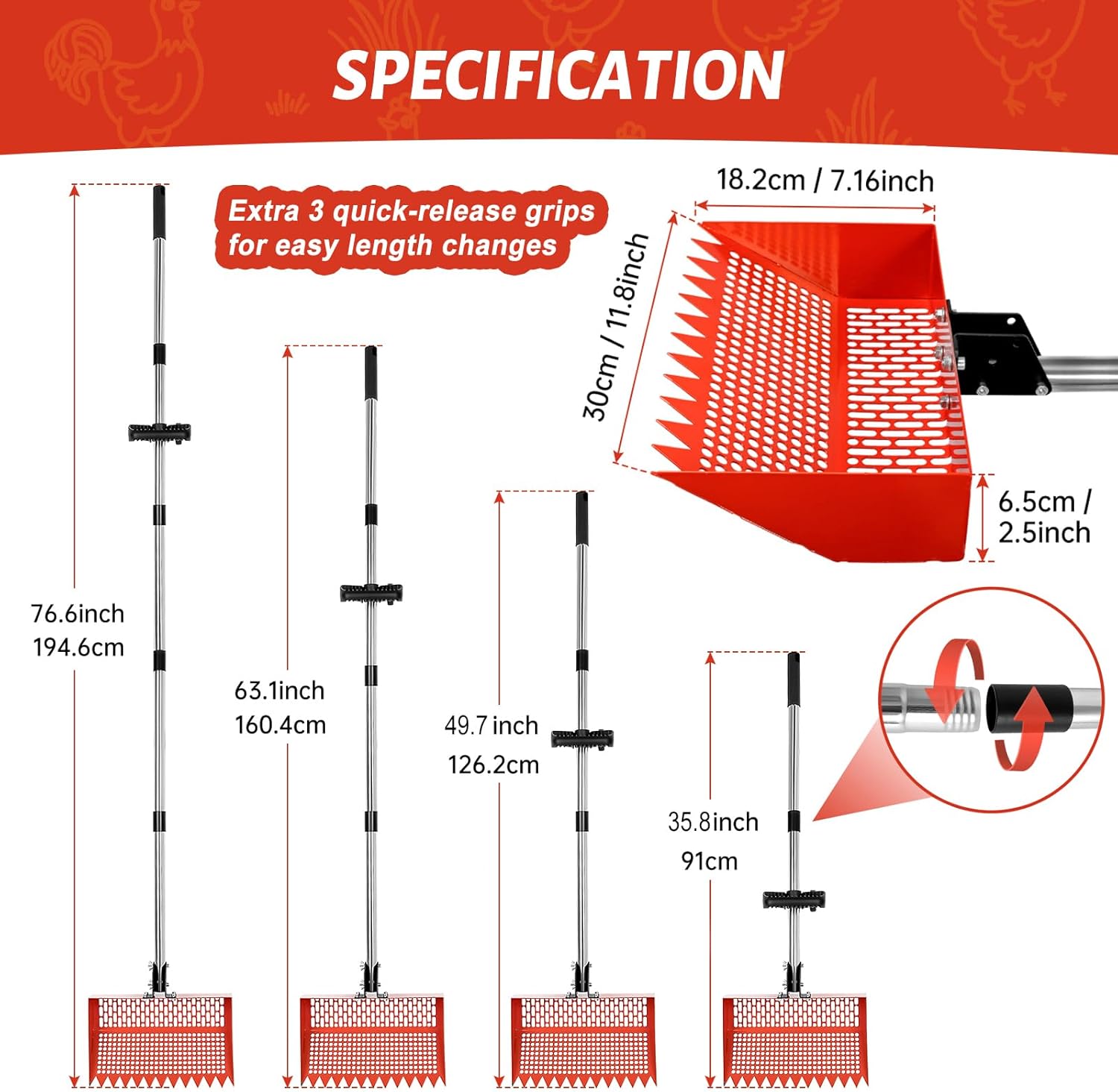 【Large Capacity】 With the extra-wide 12" scoop mouth and deep-bowl design, the chicken poop scooper holds more waste than standard rakes. The increased shovel capacity means that waste can be scooped and sifted in a single pass, which greatly enhances work efficiency and saves time. 【Adjustable Handle】 This chicken pooper scooper with telescopic handle offers three adjustable lengths (15", 35.8", 49.7", 63.1'' and 76.6''). Adjustable design allows for easy access to tight corners, deep into large coops, or elevated areas. You can use this 2-in-1 pooper scooper with just one hand, with no bending or strain on your back or knees. 【Ergonomic Assistant Handle】This chicken coop scoop has undergone a brand new upgrade, equipped with a D-shaped ergonomic handle that can be freely adjusted in angle, allowing you to say goodbye to long-term bending and frequent squatting during chicken coop cleaning work, making it more friendly to your body. 【Premium Steel】Made from tightly woven heavy-gauge steel wire, the mesh scooper head is designed to withstand wear and tear, as well as rust, while ensuring that no droppings slip through. Moreover, the saw-tooth edge effortlessly penetrates deep into the bedding, breaking up compacted waste for more efficient scooping. 【Easy Assembly】 You can effortlessly set up your long handle chicken droppings scoop in minutes with the simple threaded connection. Simply screw the handle rods together. Then attach the scooper rake head to the handle and tighten with the included screw. › See more product details