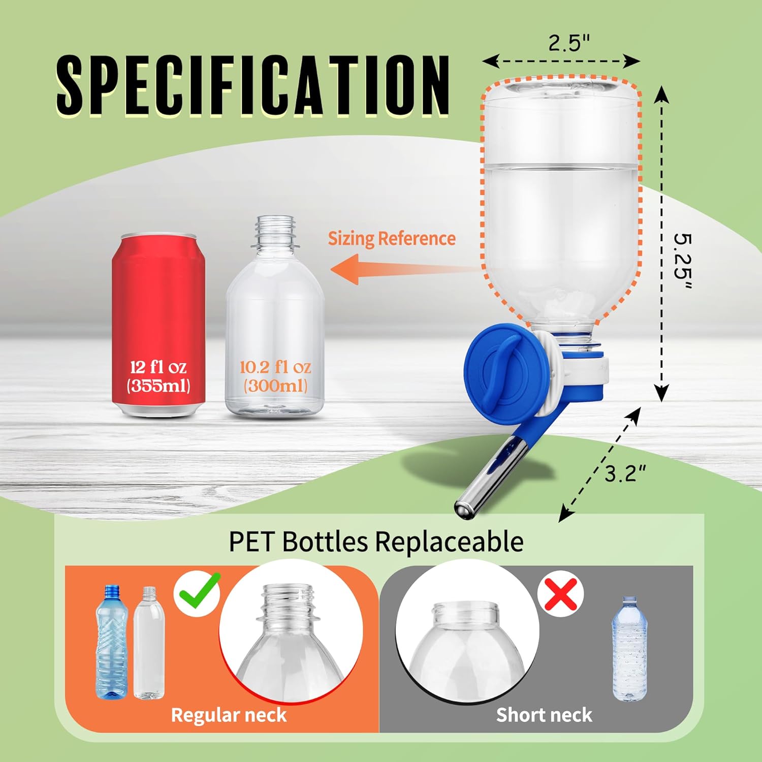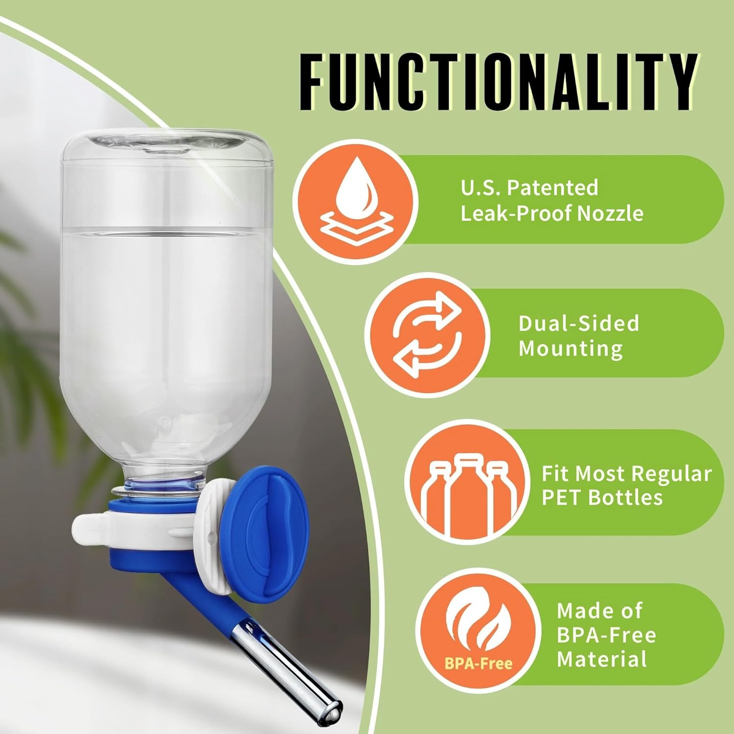About this item Leak-Proof Nozzle: U.S. patented Choco Nose design prevents water leakage; provides a dry and mess-free cage environment while keeping pets’ water clean and fresh. Easy Installation: Screw-on bracket allows simple setup with snap-on and snap-off design for convenient cleaning and refilling. Mini-Sized Nozzle: 10 mm nozzle recommended for guinea pigs, ferrets, hamsters, and bunnies; 10.2 fl.oz capacity; made of BPA-free material. Nail-On Bracket Option: Can be nailed to wall or wooden furniture with screws (not included); compatible with most standard PET bottles for eco-friendly reuse. Durable Construction: Made with high-quality, pet-safe materials designed for long-term use; resists chewing and ensures reliable performance over time. Important Instruction: Check the bottle daily and after every refill by tapping the metal ball at the nozzle tip; air bubbles confirm the water is dispensing properly. › See more product details