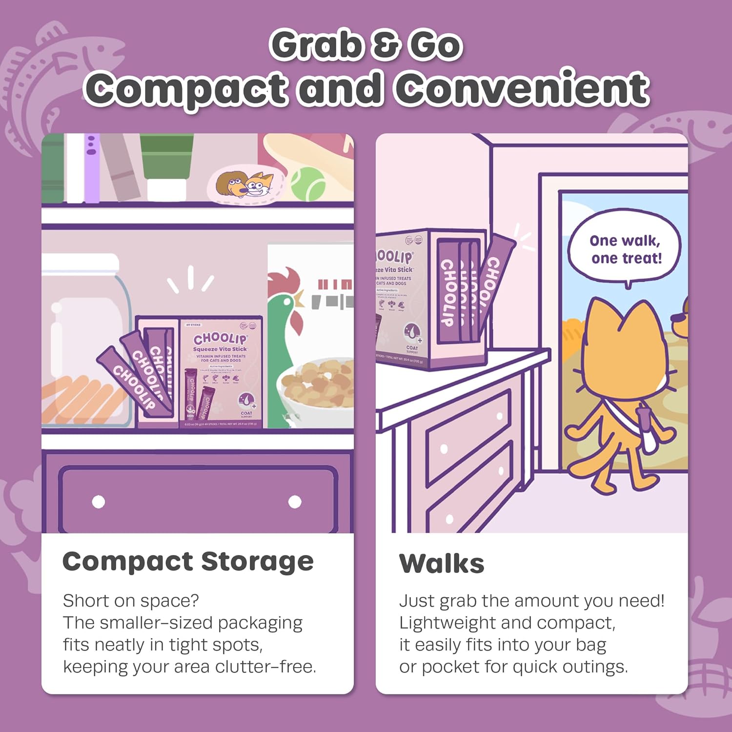 • SQUEEZE VITA STICK VET-FORMULATED SKIN & COAT PUREE TREATS Developed by Dr. Eric (DVM), these lickable cat treats and dog puree sticks deliver Omega 3, biotin, and essential vitamins to nourish skin, reduce shedding, and support a soft, healthy coat.