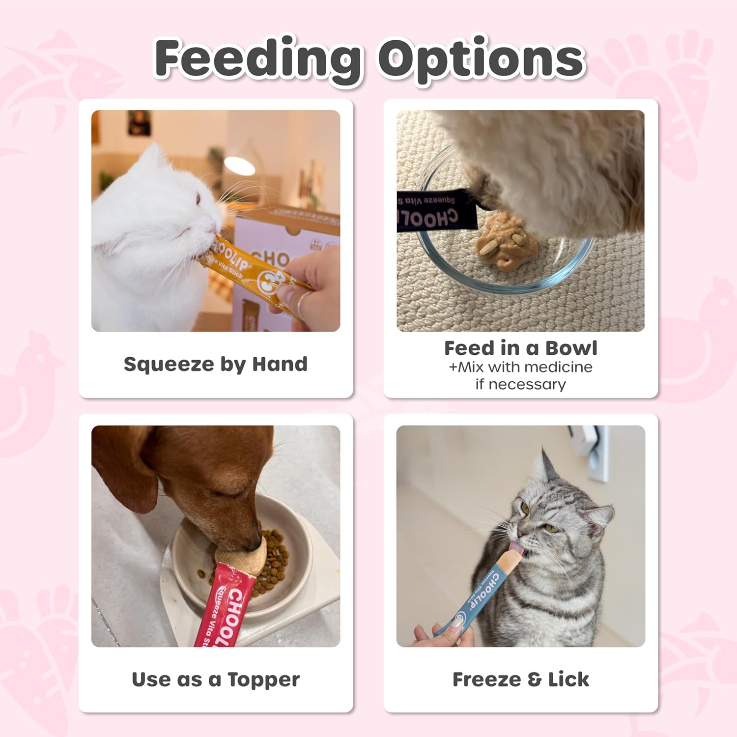 About this item VET-FORMULATED LICKABLE TREATS – Created by Korean vet Dr. Eric DVM to promote full-body wellness for cats and dogs of all ages. REAL INGREDIENTS, CLEAN NUTRITION – Salmon, tuna, and chicken blended with fruits and veggies. No grains, gluten, preservatives, or artificial additives. EASY TO SERVE, FUN TO FEED – Hand-feed, use on lick mats, as a meal topper, or freeze into refreshing treats. Perfect for training and bonding. 7 FUNCTIONAL FLAVORS – Each recipe targets a specific benefit: Joint, Skin & Coat, Heart, Kidney, Liver, Eye, and Brain support. PACK OPTIONS FOR EVERY HOME – Choose 7-Count Trial, 14-Count (2×7 Value), or 49-Count Bulk Variety Pack for multi-pet families and daily use. › See more product details