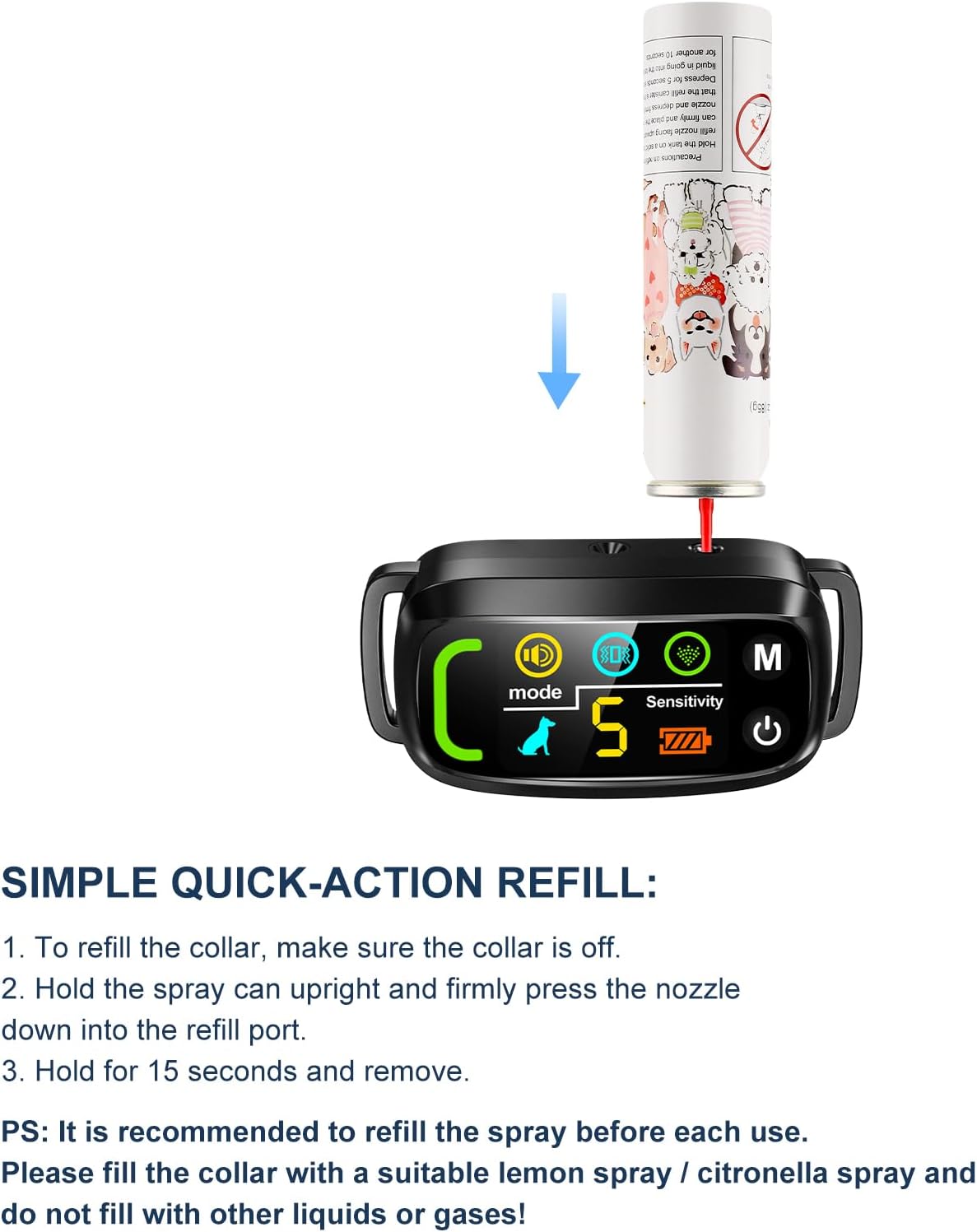 About this item - Compatible with PQJDFX, EDUPET, KDSZJDV Brands of Spray Dog Training Collars, and Pet-Safe Gentle Spray, Down-town NO BARK Collars and all other brands of citronella spray dog collars. - Contains 300-400 sprays per can, 3oz / 80ml - New formula Lemon scent spray, Stain-free & Eco-friendly formula, Harmless, Safe and Effective for humans and animals : Place the collar on a flat table, then simply remove the cover and aim it at the inflation port upright, Vigorously and Firmly press (important) the nozzle down into the refill port until you feel a sinking movement. Hold down Vigorously and Firmly for 15 seconds, and then release It is recommended to refill the spray before each use. Please fill the collar with a suitable lemon spray/citronella spray and do not fill with other liquids or gases! › See more product details