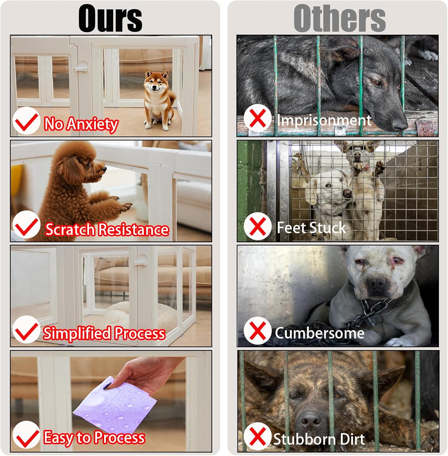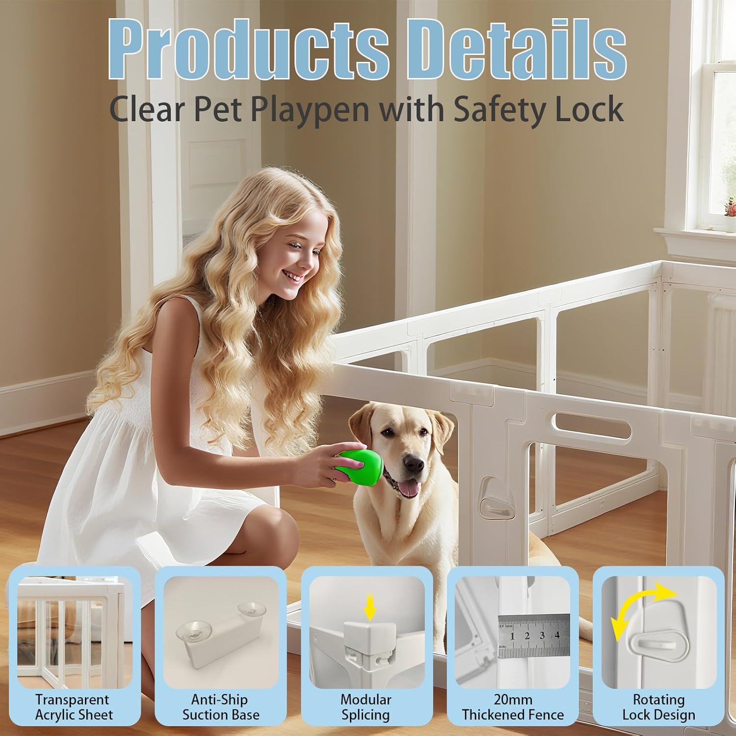 About this item 【Durable Materials】This dog playpen is made of high quality acrylic and polyethylene material, which is very wear-resistant and durable. 2 cm thick panels prevent pets from scratching and gnawing . The clear acrylic panels allow pets to see their owners without anxiety 【Easy to Assemble】 The indoor pet playpen has a modular design, which can be assembled and disassembled in minutes without any tools. The included suction cups and connectors make it easy to secure the enclosure firmly to the floor and not easy to be moved by your pet 【Large Space】 The assembled size of this 12pcs pet enclosure is 59.1x59.1x23.6 inches, perfect for two small dogs and a cat. It can also be attached to the side of the wall with a DIY shape to widen the space for your pet 【Safety Locking Door】 The small pet playpen has a safety locking door to prevent pets from escaping. Note: This pet enclosure can only catch small and medium-sized animals weighing up to 11 kilograms and with a shoulder height of up to 35 centimeters 【Multi-functional & Stylish】Transparent Pet Pen is not only practical but also stylish, the sleek white design complements any home decor. It is perfect for indoor use and can be easily moved around to create a designated play area for your pet › See more product details