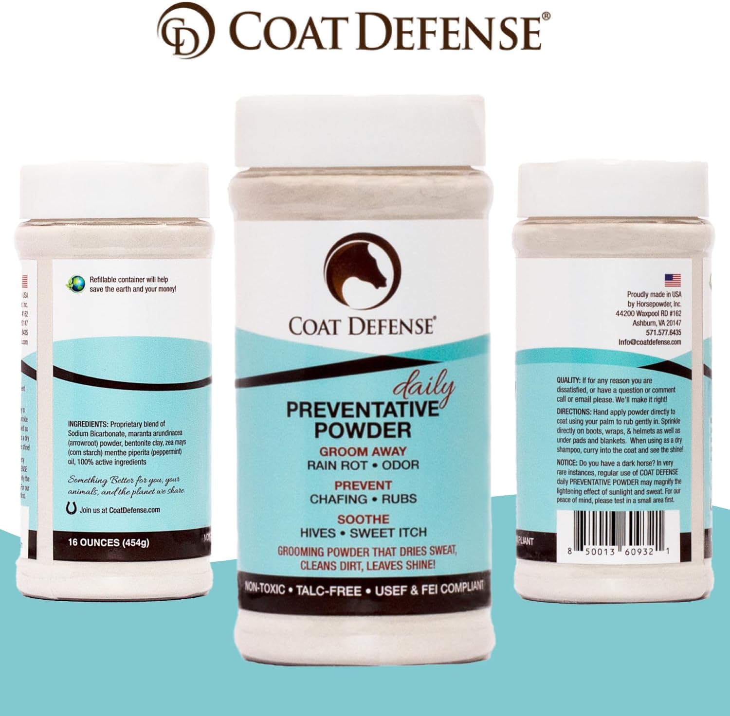 About this item HORSE ITCH RELIEF: Formulated with natural ingredients, coat defense for horses provides relief from your horse's itchy and inflamed skin caused by insect bites, hives, or environmental allergens. To clean and deodorize your horses’ skin, just brush this powder through its coat, mane, and tail. It offers a beautiful shine without any need for soap, water, or harsh chemicals! PREVENTS MULTIPLE COMMON COAT ISSUES: Our equine supplements form an effective barrier against skin and coat ailments, our waterless shampoo for horses helps in drying up sweat and keeping your horse looking and smelling great. Additionally, this powder works to eliminate and prevent skin ailments and odor. PREVENT SKIN FUNK: This powder protects against infection and dissipates odor! To prevent “skin funk”, use this powder under saddle pads, blankets, and in therapeutic boots to keep your horse dry and odor-free. Use this powder to prevent chafing/rubs under equipment like boots and Rx boots. NATURAL & NON-TOXIC INGREDIENTS: Safe for all horses! Instead of using harsh products with medication on your horse, use this safe and effective anti-itch horse shampoo that is made with a natural proprietary blend of safe and non-toxic ingredients. Non-toxic and talc-free. Our vet supplies for horses are formulated without synthetic, caustic, or known skin allergens. MADE IN USA: Satisfaction guaranteed! Crafted from only safe and readable ingredients, Coat Defense’s horse care products are handmade in Ashburn, Virginia. Unlike most horse shampoo and conditioner 2-in-1 products, this horse shampoo is also a USEF & FEI compliant product. No worries if the horse licks the powder, it can safely be reapplied as needed! › See more product details