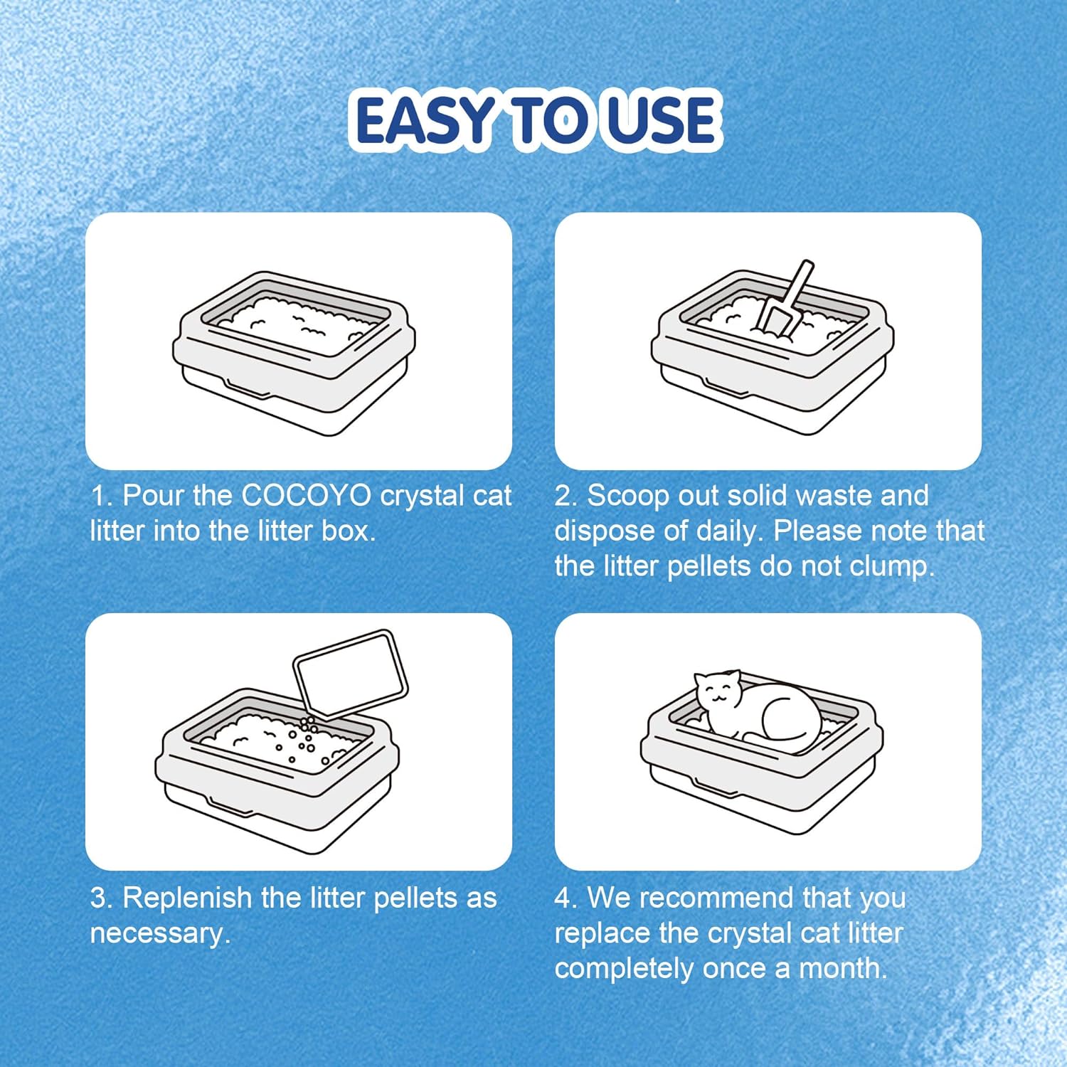 - Directions: 1. Pour the COCOYO Crystal Cat Litter into the litter box. 2. Scoop out the solid waste and dispose of. Please note that the COCOYO Crystal Cat Litter does not clump. 3. Replenish the litter as necessary.
