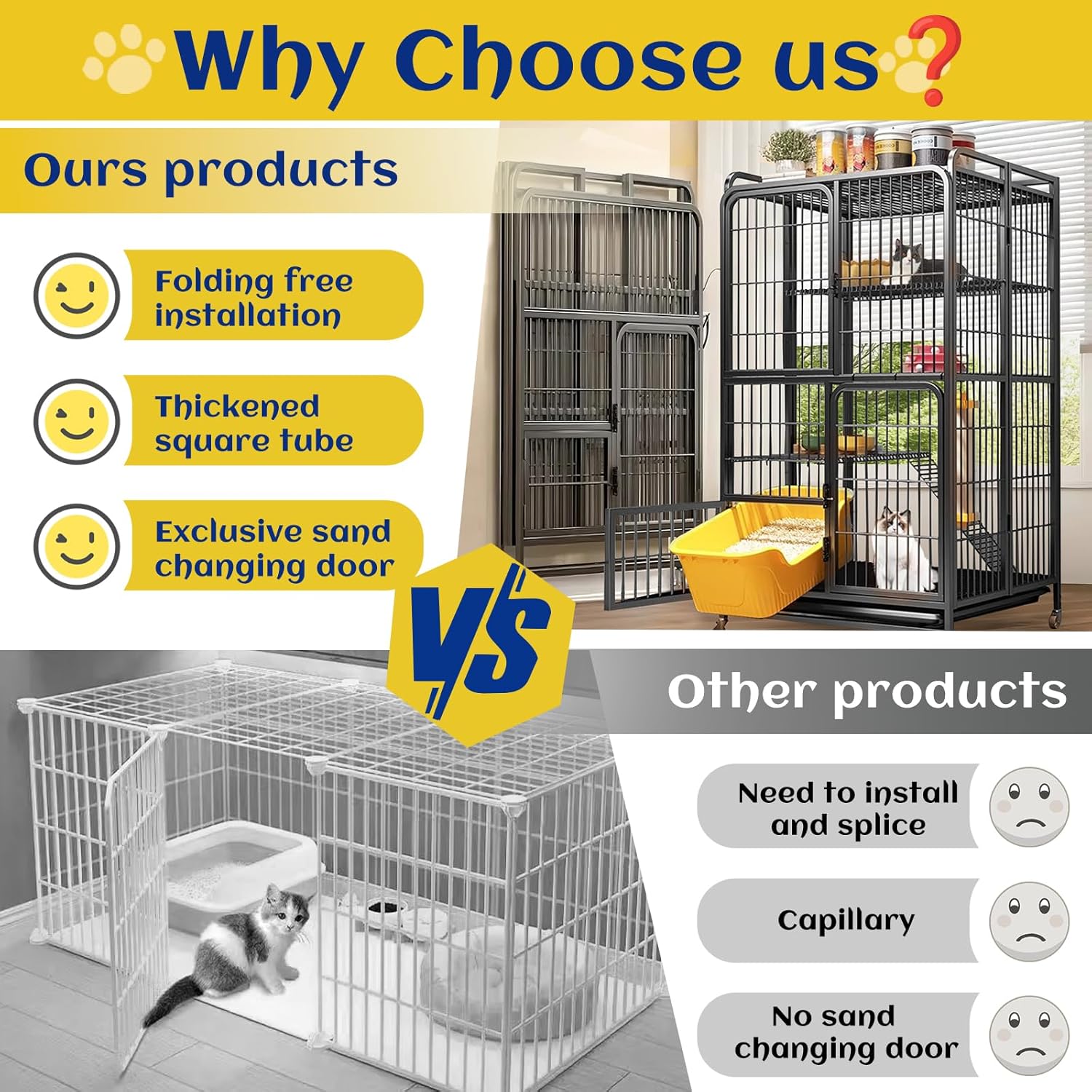 About this item Collapsibles Cat Cages Indoor: Our large cat crate does not need to be assembleds or disassembled, it can be used after opening, which solves the troubles of assemblys and splicing; cat enclosures after folding, the thicknesss is only 2.5 inches/6.5 cm, whether it is a corner, under the bed, or in the trunkes of a car, any corner can be perfectly stored without taking up space, making it easy to keep pets in a small apartment and transport them outdoors 2/3/4-Tier Duplex pet enclosures: The indoor cat cage is equippeds with a ladderss and a spacious platforms. You can customize the layouts, with an uppers sleeping bed + a middle play areass + a bottom toiletes. The partitions are scientifices and worry-free. The cat enclosures is large enough to accommodates 1-3 adult cats to play together.This large-space cat kennel provides amples verticasl space for climbing and perching, satisfyings the pet's playfulss nature. More comfortable cat enclosures indoor: 2/3-Tier kitten cage, with 2 front doors and 1 skylight. 4-Tier pet crate, with 3 front doors and 1 skylight, promotes air circulations, allowing cats to enjoy natural sunlight, and facilitates your interactiones with your cat; the pet cage top flat surfacess can be used to place cat food, toys or daily necessitiess, saving space, practicals and convenients! All doors are equippeds with safety locks, so you can be more assureds and your cat is safer Easier to move & clean pet crate: The cat cage is specially equippeds with a small door for changing cat litters, which can accommodates a cat litters box of L19*W13*H9 in (need to bring your own), which can be easily pulleds out for cleaning, saving time and efforts; 4 360° universal wheels (two of which have brakess) are easy to move, fixed firmlys, and more convenient to clean or adjust the positions! The bottom is designed with a pull-out plastic tray for your conveniences to clean Large Metal Animal cage: Our kitten crate is made of solid square tube frame and metal wire, which is chew-proof, bend-proof, scratch-proof, and the surfacess is covered with black powders coating, which is rust-proof and wear-resistant, ensuring the stabilitys and durability of the cat enclosures. The one-piece top and body are fixed with safety hooks to ensure the stabilitys of the structure, minimizes the shaking when jumping and prevents collapse › See more product details