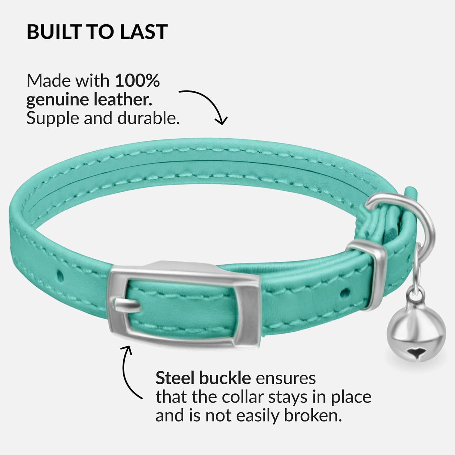About this item Total length of this collar is 12", width is 3/8", weight is about 11 grams. It may fit 8"-11" cat's neck. PLEASE, MEASURE your cat's neck with a soft measuring tape to choose correct size. Make sure you can fit two fingers between the collar and you cat's neck. SIZES CAN VARY BETWEEN AGE OF CATS AND BREEDS. This beautiful handmade cat-safe leather cat collar comes with bright-colored tiny metal bell. Color of the bell may vary. Made out of soft genuine leather, this elegant collar for kittens is hand stitched to ensure you’re getting a long lasting good quality product. Elastic strap is designed to allow easy release in case your pet’s collar snags on to something. Bright color will make your cat easy to spot and a metal bell will help you to keep monitor kitten’s whereabouts. It's safe and looks stylish! Handmade leather cat collars is a perfect combination of style, high quality and comfort. These leather collars for adult cats as well as kittens are comfortable, pliable, light and elegant. Quality hardware is used to make these genuine leather collars for cats. We also offer matching leather leashes for our adjustable Leather collars for cats. Browse our store for other matching products. › See more product details