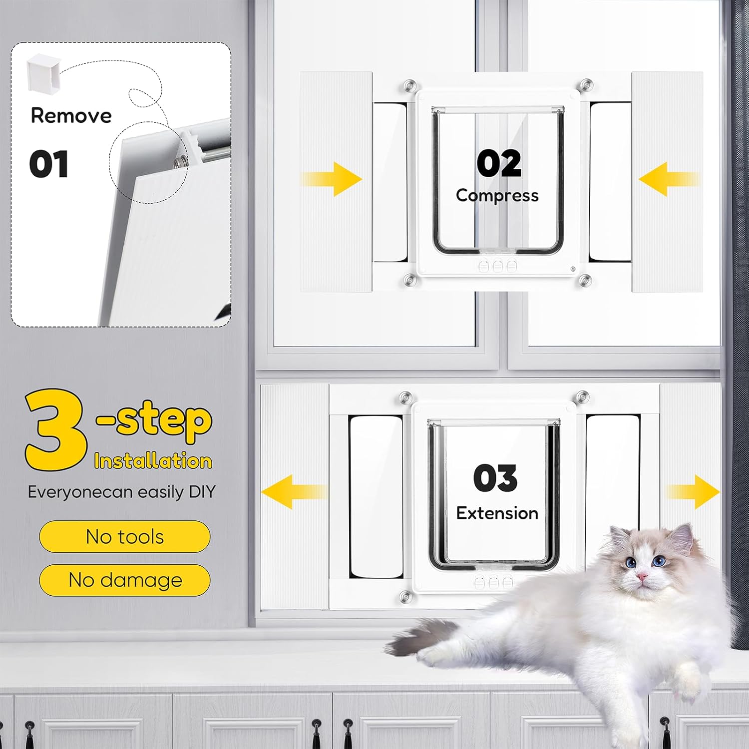 About this item Compact cat door: This window cat door has a slightly weaker magnetic strength, making it very suitable for cats of normal size, weak physique, timidity, or slow learning to ensure easy entry and independent passage. Relatively high-type cat doors have extremely high cost-effectiveness 10 min quick installation: Non destructive installation, will not damage existing walls and windows, cat door for window can be installed and disassembled in a few minutes. Very suitable for tenants and people who are tired of frequently opening and closing doors for cats Weatherproof pet door for window: Built in weatherstripping can effectively block wind and rain. At the same time, foam buffer strip and vinyl weather strip are included, which can effectively maintain the temperature of the home and greatly reduce the energy expenditure caused by leakage Aluminum alloy frame: Aluminum alloy integrated design, excellent workmanship. The exterior is coated with a white layer to enhance aesthetics while preventing scratches and clothing. High definition hard glass provides a broad and clear view 𝗖𝗼𝗻𝘀𝗶𝗱𝗲𝗿𝗮𝘁𝗲 𝗮𝗳𝘁𝗲𝗿-𝘀𝗮𝗹𝗲𝘀 𝘀𝗲𝗿𝘃𝗶𝗰𝗲: We are committed to providing customers with high-quality products and after-sales service. We offer a three-year after-sales service, during which any malfunctions do not require the product to be returned and will be replaced directly! Your pet will love this door › See more product details