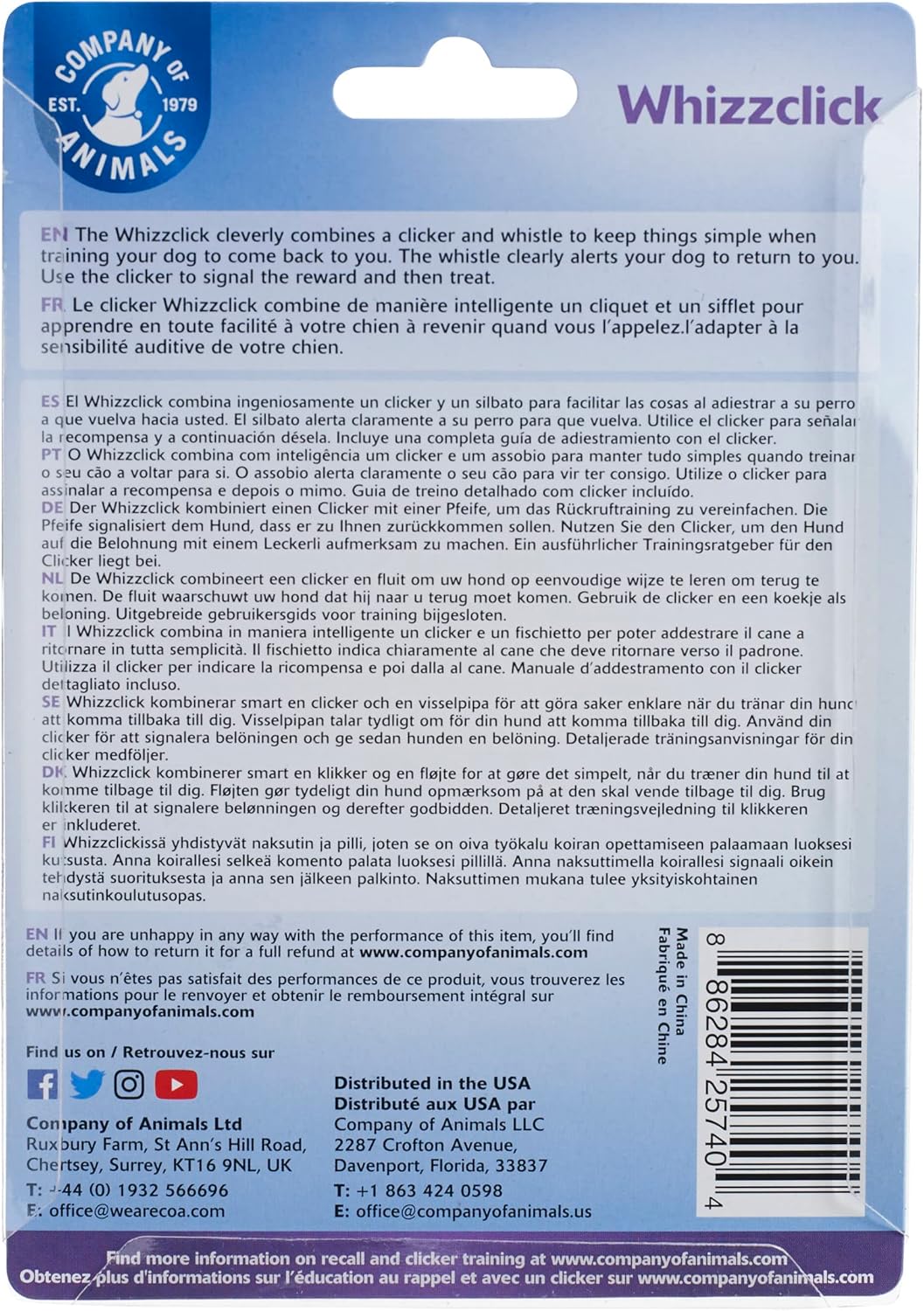 The information below is per-pack only WHISTLE AND CLICKER: The Whizzclick is a patented training aid that combines two of the most popular dog training tools; a clicker and a whistle, making it an essential training product. RECALL TRAINING: Whistles are great for recall training as they help to standardise commands and are great for all the family to use. Perfect for all puppies and dogs 8 + weeks. DISTANCE CONTROL: Using a whistle allows you to have control over a greater distance and enables use to use distance commands, such as 'sit'. CLICKER TRAINING: The Whizzclick clicker, has a very clear sound, it's easy and comfortable to press and use. The whistle produces a single tone that travels well in open spaces. WRIST STRAP: The elasticated wrist strap means the WhizzClick is always to hand › See more product details