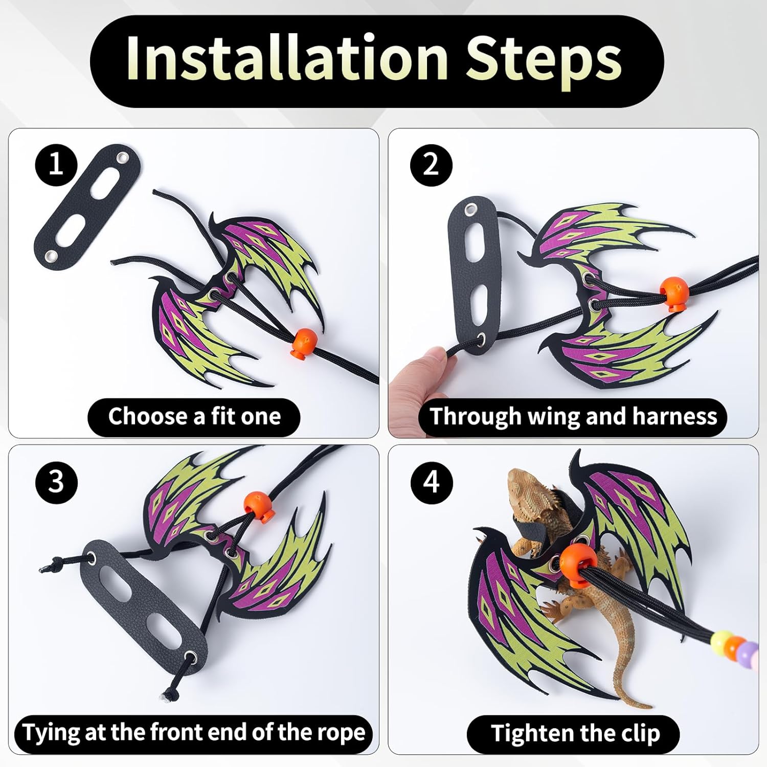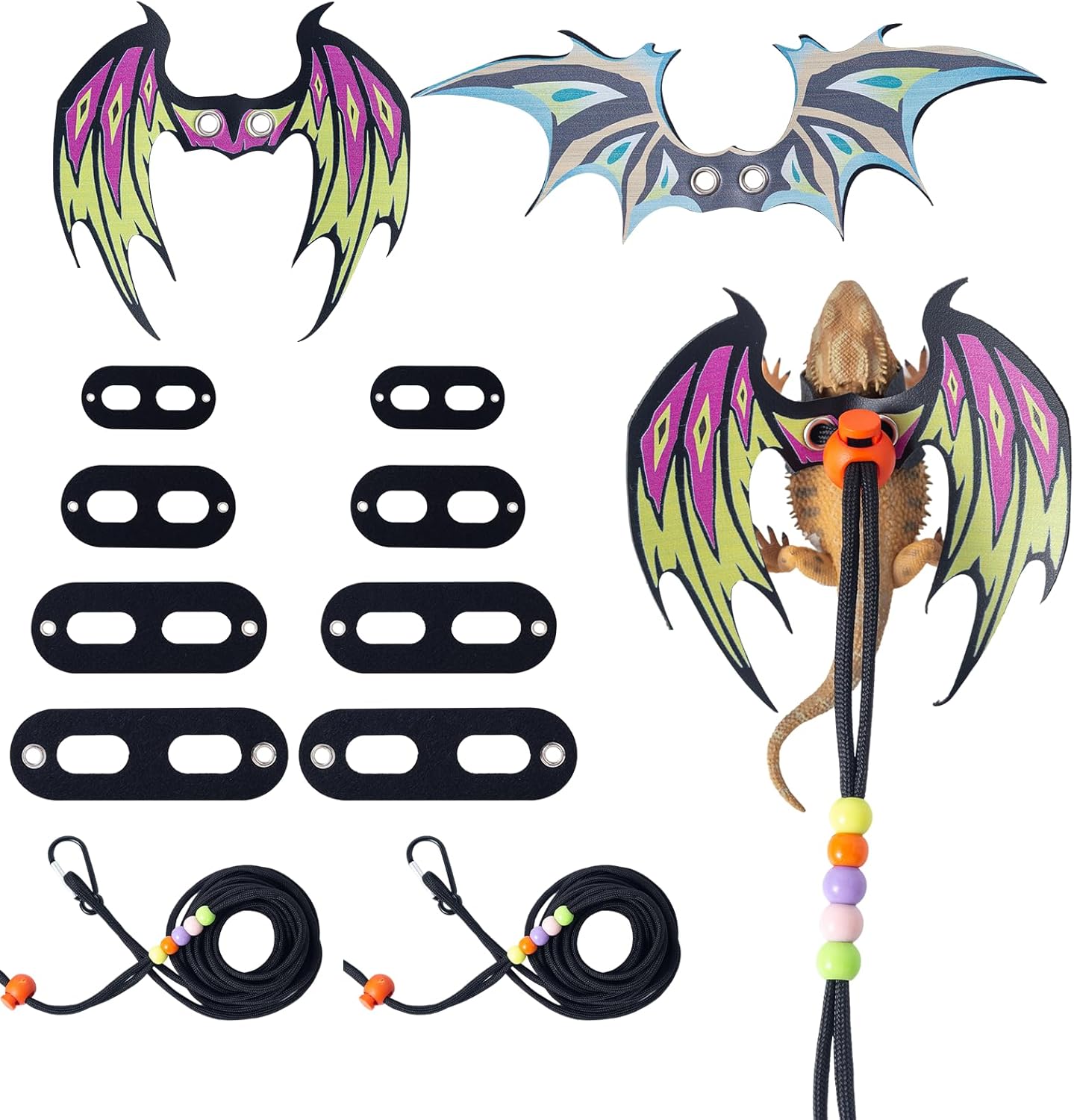 About this item Multi-Size Available: Our reptile harnesses are available in extra small, small, medium, and large to accommodate your pet's growth in different stages, suitable for bearded dragon, geckos, crested gecko, lizard, and chameleon. Please measure your pet's chest girth for the best fit before purchasing Comfortable Material: Made of artificial leather, our reptile lizard harness and dinosaur wings are lightweight, soft, and easy to use, allowing your reptile friends to stay in good condition while crawling Charming and Fun: Available in multiple colors, our artificial leather dinosaur wings add a fun, eye-catching element to your pet's harness, making your bearded dragon easily recognizable and adorable during walks and enhancing the outdoor experience. A good decoration and gift for your reptile pet Complete Set: Each package includes 8 pcs reptile harnesses (2 of each size: extra small, small, medium, large), 2 pcs colorful dinosaur wings, and 2 pcs bearded dragon leashes, providing everything you need for your pet's adventures Adjustable and Secure: Our bearded dragon leash features an adjustable clip, allowing you to customize the fit for maximum comfort. The 78.74'' reptile leash length offers freedom while keeping your pet safely within reach › See more product details