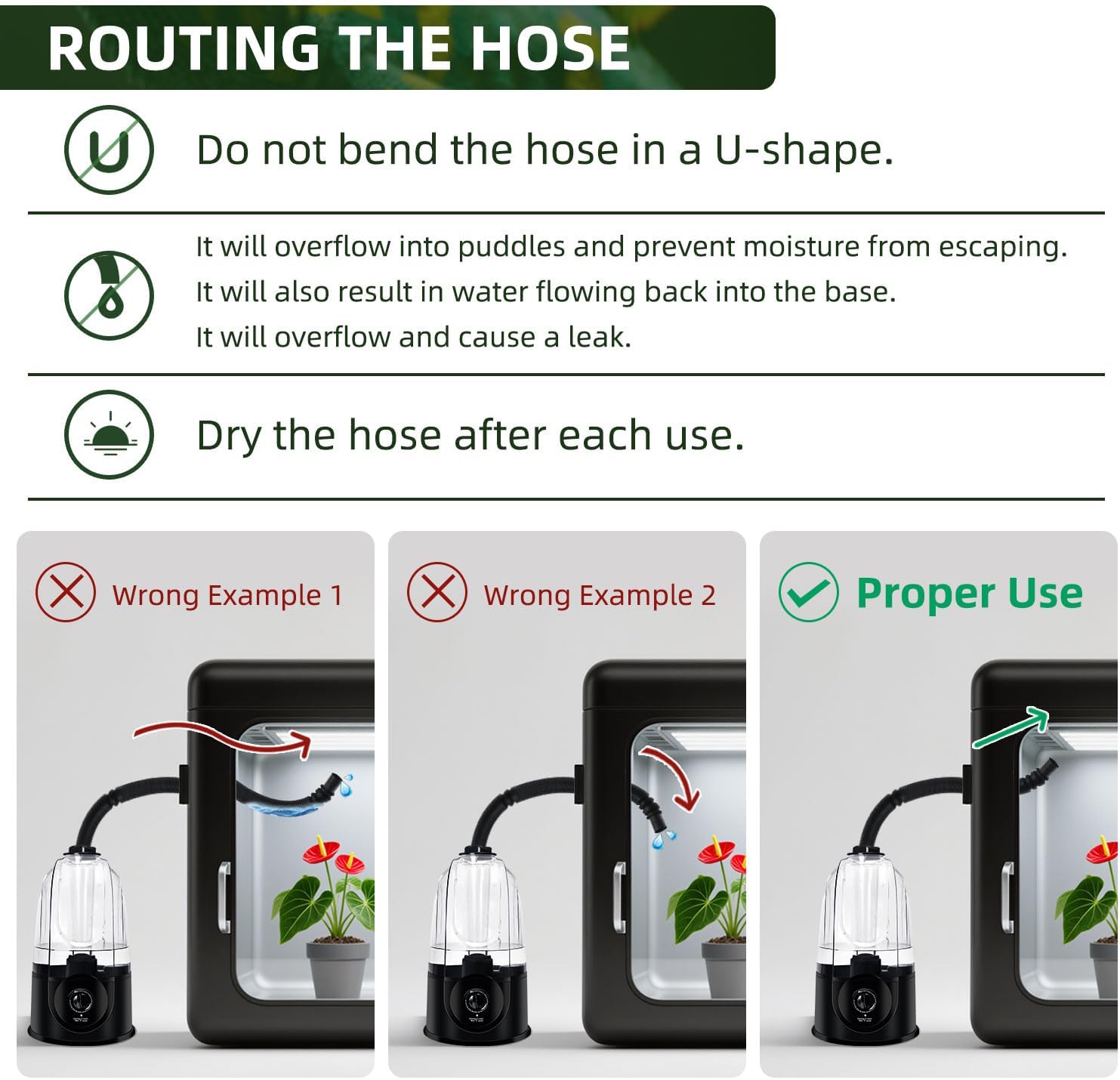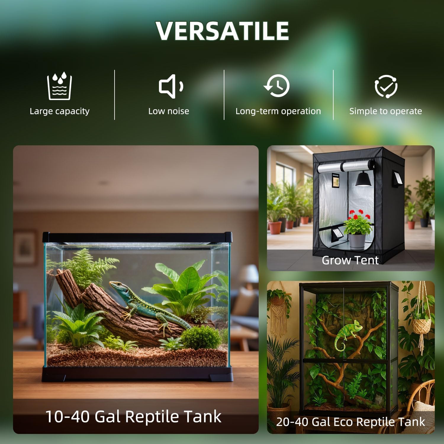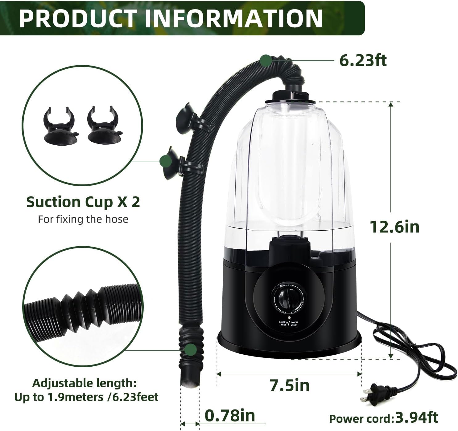 About this item 3.8L LARGER CAPACITY: The Reptile Fogger Mister size is 13x7.5x7.5 inch, with an adjustable (1.5-6.3feet) hose and two suction cup for fixing water tube. This reptile humidifier is perfect for beginners, with just one knob and simple operation. Recommended for 10-40 gallon single-compartment terrariums. DRY-OFF PROTECTION: Can work continuously, if the water in the tank is dry, this terrarium humidifier's indicator light changes from green to red, and it will automatically stop working. One refill can last up to 26 hours at medium misting level, and 10 hours at max misting level(380ml/per hour). ADJUSTABLE MIST OUTPUT: There is a rotary button on the front of this fogger to adjust the cold mist output. NOTE: THERE IS A SWITCH ON THE BACK, REMEMBER TO TURN IT ON BEFORE USE. FINE MIST & SILENT RUN: Ultrasonic atomization reptile humidifier, fine mist, uniform humidification without water accumulation. Low noise design (<35dB) does not disturb the rest of reptiles, especially suitable for humidification needs at night. WARRANTY: Due to the long transportation, after receiving the parcel, please check carefully. If the reptile mister broken, do not work or any problem, please check the informationl on the package. NOTES: This humidifier does not have timer and humidity monitoring functions. Please confirm product details and features before purchasing. WARM TIPS: This automatic misterr does not have a timing function, and the knob can only control the amount of mist. We pay more attention to humidification itself, which will extend the service life of the fog machine. NOTES: Do not move the device or add water while the humidifier is running. › See more product details