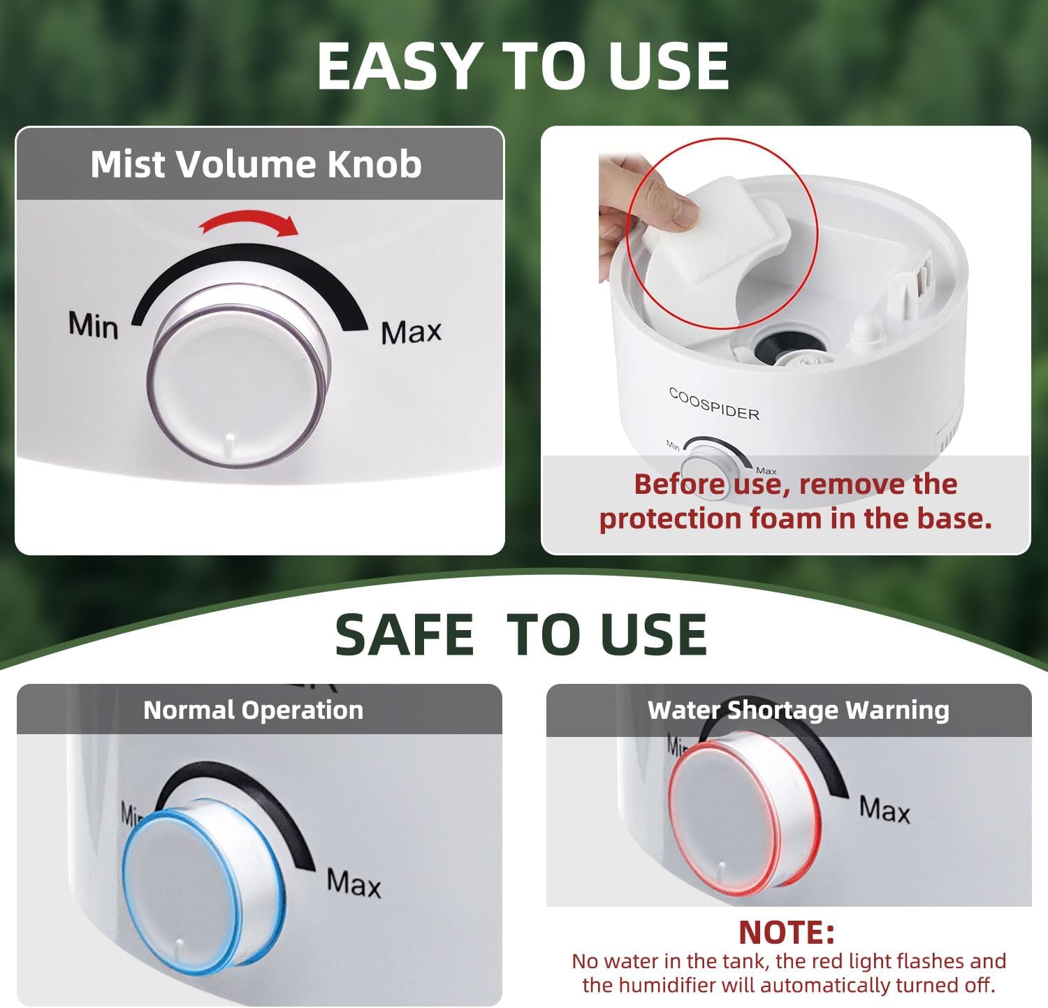 About this item TOP FILLING DESIGN: Easy to add water from the top, this large reservoir can hold 4.2L/1.11Gallon water. There is no need to move the reptile fogger humidifier when adding water, which can reduce the probability of water flowing back to the base and extend its service life. Top filling, plus the removable lid, make this reptile humidifier easier to clean and maintenance. 4.2L/1.11Gallon LARGER CAPACITY: The whole fog machine size is 7.5*7.5*11 inches, with an adjustable (1.5-6.3feet) hose and two suction cup for fixing the tube. This humidifier is recommended for terrariums of 50-100 gallons, and ideal for terrarium DIY enthusiasts. ADJUSTABLE MIST OUTPUT: There is a rotary button on the front of this terrarium humidifier to adjust the cold mist output. One refill can last up to 12 hours at max misting level(380ml/per hour). When water run out, the terrarium mister will shut down automatically to keep security. FINE MIST & SILENT RUN: Ultrasonic atomization reptile fogger humidifier, fine mist, uniform humidification without water accumulation. Low noise design (<35dB) does not disturb the rest of reptiles, especially suitable for humidification needs at night. 1-YEAR WARRANTY: Due to the long transportation, after receiving the parcel, please check carefully. If the reptile mister broken, do not work or any problem, please be free to contact our service email on the package, we will contact you in 24 hours. WARM TIP: To prevent water from flowing back to the atomizer at the base and affecting the normal operation of the reptile misting system. The connection between the cover and the mist outlet pipe is not sealed, so it is normal for mist to leak from the top when the equipment is running. NOTES: Do not move the device or add water while the humidifier is running. › See more product details