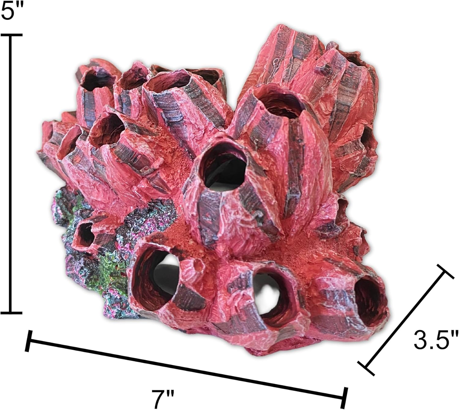 Add a pop of vibrant color and natural texture to your underwater landscape with the Gingerbread Pet Supply Coral Ornament. This intricately designed piece features a cluster of rich red and dark red barnacles, densely packed on a realistically sculpted model rock. Crafted from high-quality, aquarium-safe resin, this decoration is completely inert and safe for both freshwater and saltwater environments. The deep red hues create a stunning contrast against green plants, blue water, and sandy substrates, making it a perfect focal point. Measuring 7" x 3.5" x 5", it's an ideal size for creating a dynamic and visually appealing aquascape that your fish will love to explore.