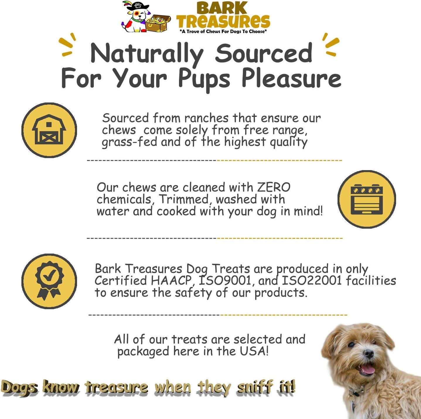 Let their taste buds sail the seven seas, and let Ol' Captain Bark Beard show you all of the exciting Bark Treasures that have been collected on our adventures. They "Arggh!" sure to put a smile on your favorite land lovers face! Bark Treasures Cow Ears Dog Chews are 100% Fully Digestible and safe for your pup. Our Healthy Cow Ear Dog treats are oven-baked and don’t contain any harmful chemicals or substances.Their organic oils are excellent for your pup´s skin & coats, and they also promote healthy canine teeth and gums. Cow Ears for dogs are an excellent source of Chondroitin which are essential for your dogs joint health! The chew time will vary based on your dog's individual size and breed. All of our Cow Ear dog treats are carefully sourced from free range grass fed cattle and cooked with Bark Treasures special recipe to let your dogs taste buds sail the seven seas. We highly recommend a daily chew for your pup since a busy pup is a happy pup. Cow Ears dog chews can also help reduce anxiety during a time your pup is alone or is being crate trained. I hope your loved one will enjoy our all natural cow ears dog chew rawhide alternatives! Cow Ears Guaranteed Analysis Crude Protein: 72.12% Crude Fat: 17.87% Crude Ash: 2.45% Moisture: 7.56%