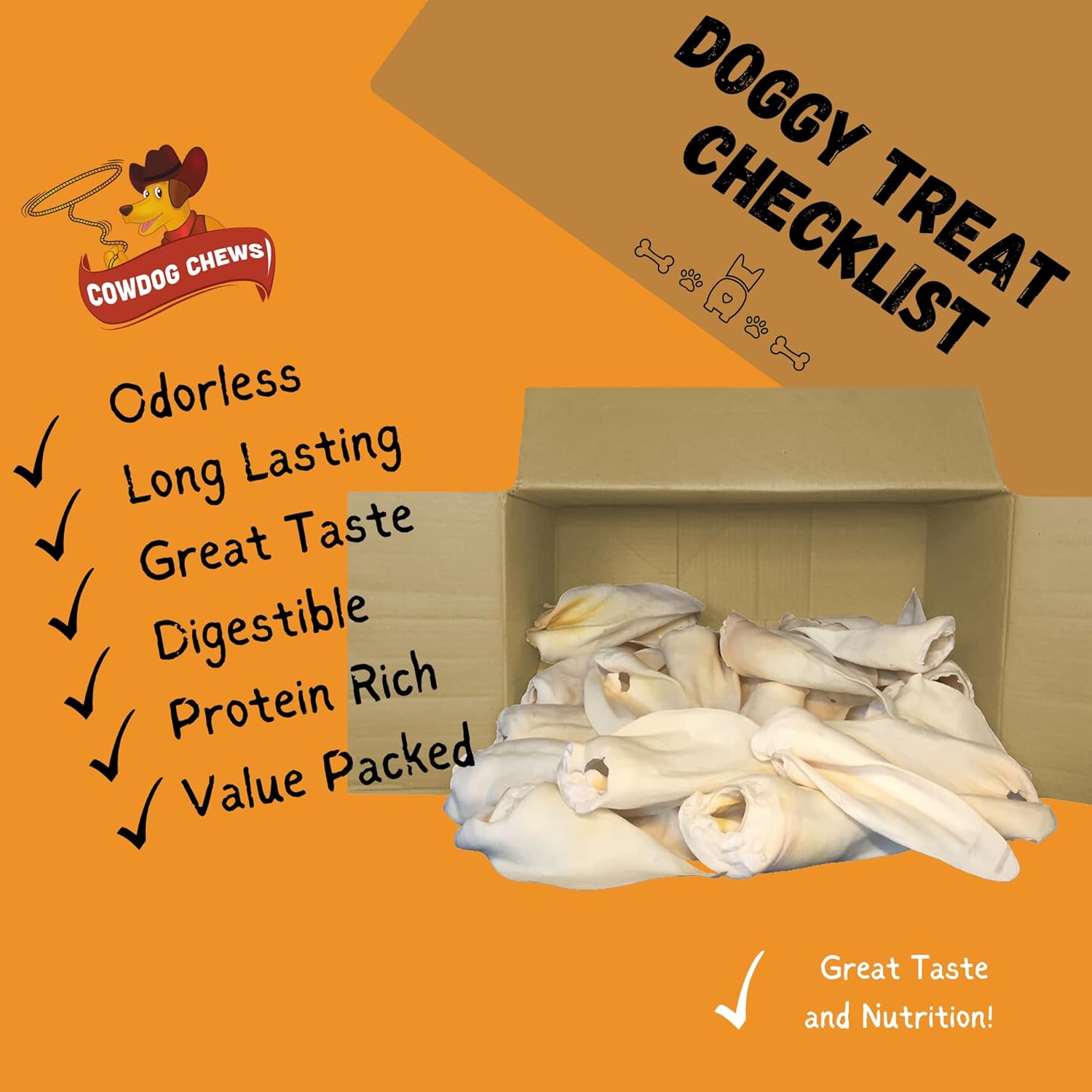 About this item All-Natural & Digestible – Made from 100% natural cow ears, free of preservatives, chemicals, and artificial flavors. A safe and healthy alternative to rawhide chews. Supports Dental Health – Chewing action naturally helps reduce plaque and tartar, supporting cleaner teeth and fresher breath. High Protein, Low Fat – Packed with natural protein while being low in fat, making them a nutritious, guilt-free treat for your dog. Long-Lasting Chew – Satisfies your dog’s natural chewing instinct and helps relieve boredom, anxiety, and destructive chewing behaviors. › See more product details
