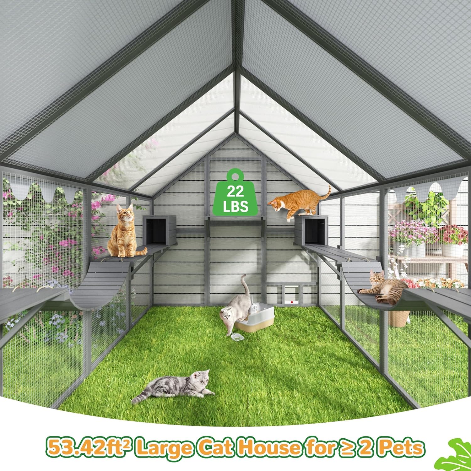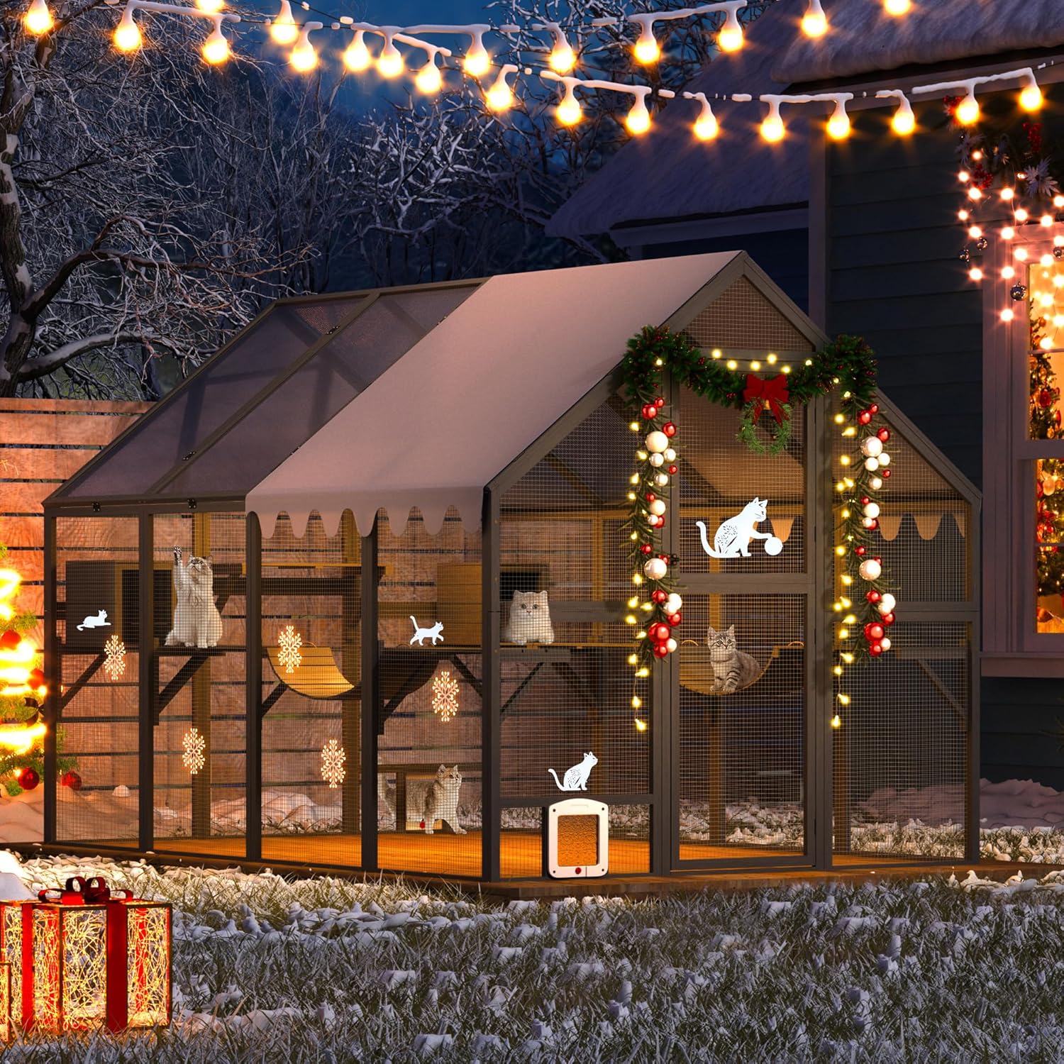 About this item 【Convenient & Free to Access】 Our large cat catio is designed with 2 small doors and a 60" tall large door to attach our house or cat tunnel. Each flexibile small door provides 4 adjustable modes: fully locked, free entry and exit, one-way entry only, and one-way exit only. Easy to get in and out, ensuring enjoyable interactions and safely explore nature for your cats 【All-Weather Protection】Designed with a fully covered roof constructed with 4 durable sunshine boards and 1 removable pvc oxford cloth, the extra-large outdoor catio delivers a refreshing shade during bright sunny days and shields your pets from winds, rain, and snow. Give your feline companions the freedom to explore nature safely, no matter the weather conditions 【Spacious Cat Paradise】Designed with 7 jumping platforms, 4 sunshine boards, 4 galvanized meshes, 2 bridges and 2 condos, our large catio provides your furry friends an all-in-one ample outdoor activity center to play, stretch, rest and relax. Overall Size: 108"L x 71"W x 74"H 【Sturdy & Safe】Crafted of FSC-Certificated solid natural wood frame and heavy-duty galvanized wire meshes, inside and outside locks, our large cat enclosure provide enhanced safety for raising multiple cats outdoor 【Easy to Assemble】Comes with an step-by-step user manual & installation video. Note: The extra large catio is shipped in 2 separate boxes, and arrival times may differ. Recommend for assembly with 2 or more persons and a power drill › See more product details