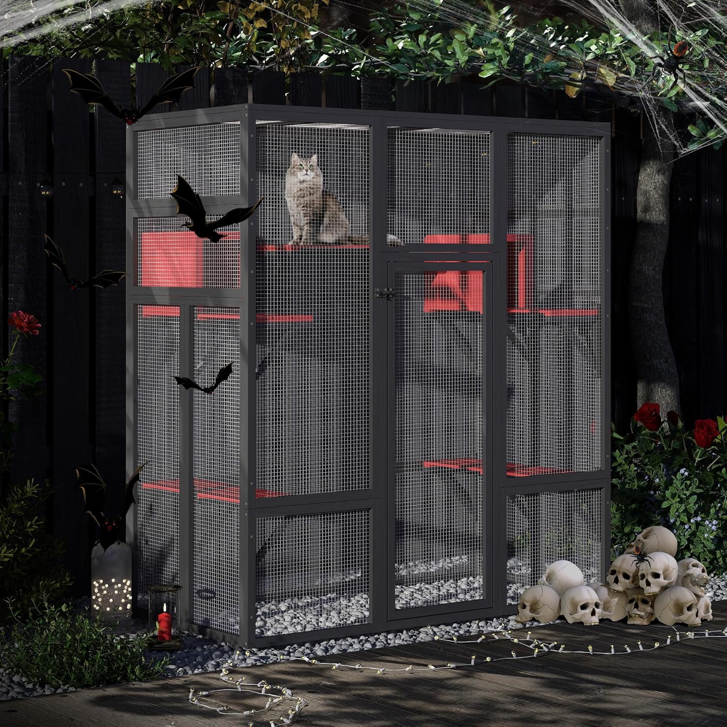 About this item Spacious and Secure Cat House: This large wooden cat house offers ample space with multiple platforms, including 7 jumping platforms and 2 resting boxes. Built with a sturdy, rainproof design and equipped with a safety door and lock, it's the ideal outdoor playpen to keep your pets active and secure Versatile Window-Connecting Design: Easily attach this catio indoor to your house window by uninstalling the back upper part. The large, rainproof enclosure features multiple platforms and a safety door with a lock, allowing your cat to enter freely or enjoy its own space. It's a perfect solution for indoor and outdoor living, providing both safety and convenience Comfortable and Weather-Resistant: The top of this catio indoor cat enclosure is covered with a double-layer hollow sheet that blocks harsh sun rays and shelters your cats from rain. With multiple platforms, and a safety door with a lock, your kitties can comfortably lounge while staying protected from the elements Effortless Assembly and Maintenance: This large catio comes with pre-drilled and labeled parts for easy assembly. The detailed manual guides you through setup. For thorough cleaning, simply open the large doors and walk into the enclosure, making upkeep simple and efficient Waterproof Roof Cover:The outdoor catio is roofed in sun panel material, which is waterproof and, at the same time, allows your cat to sunbathe, providing a warm and comfortable environment for your cat › See more product details