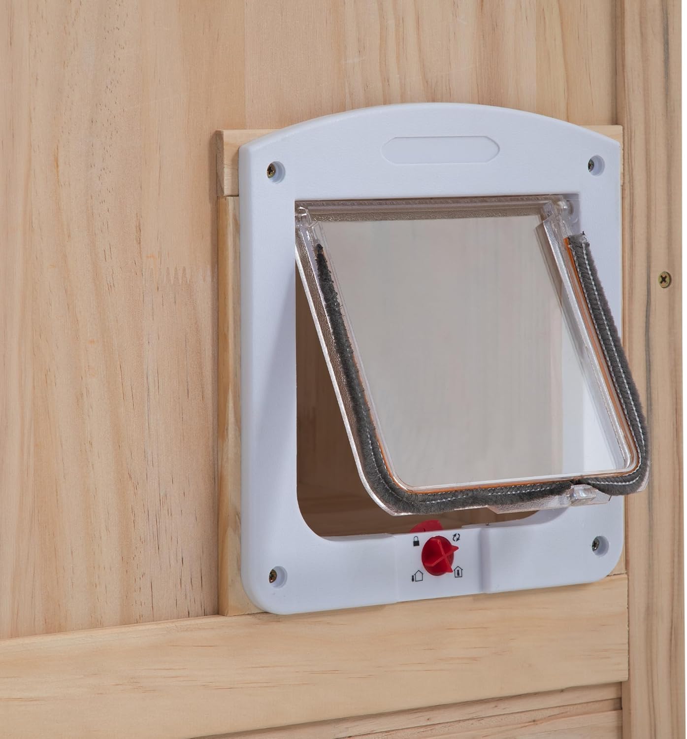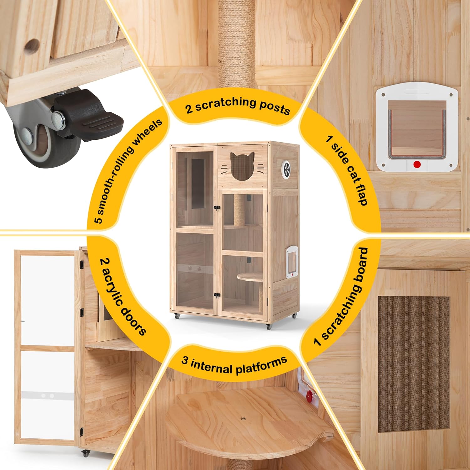 About this item 【Spacious Multi-Level Design for Cats】:This large wooden cat house features a thoughtfully designed multi-level layout with 3 sturdy internal platforms, offering your feline friends plenty of room to climb, explore, perch, and relax. 【Pet-Safe Materials for Long-Lasting Use】:Crafted from radiata pine, reinforced with galvanized mesh, and finished with clear acrylic panels, this cat enclosure ensures durability, stability, and safety, providing a secure environment for your cats. 【Easy Access and Clear Visibility】:The front of the enclosure features 2 transparent acrylic doors for easy viewing and interaction. A convenient slide-up acrylic door on the lower left side allows flexible access, while a side cat flap and top ventilation hole ensure continuous airflow. 【Built-In Scratching Fun】:Equipped with 2 built-in sisal scratching posts and a replaceable scratching board, this cat house satisfies your cat’s natural scratching instincts, helping to keep claws healthy and your furniture safe from damage. 【Smooth Mobility and Flexible Interaction】:Designed with 5 360-degree rotating wheels, this cat house can be easily moved around your home without lifting. The combination of clear doors, side entry allows you to interact effortlessly, making cleaning and feeding convenient. › See more product details