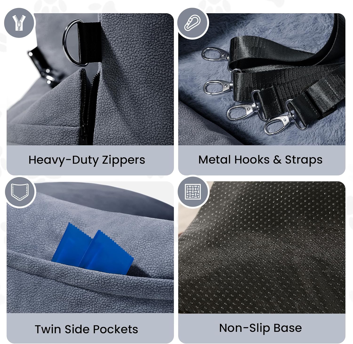 About this item Extra Safety Features: With thick sides and dense cotton padding, our booster seat protects your pet from bumps and stops, keeping them safe while you drive. Portable and Convenient: This booster seat's lightweight design and easy-carry handle make it effortlessly portable, allowing you to quickly set it up in any vehicle and provide your pet with a comfortable and secure travel experience wherever you go. Easy to Clean: Our booster seat is designed for easy care. It repels stains from drool and urine thanks to water-repellent technology, and is machine washable for simple upkeep. Comfort and Tough Fabric: This booster seat combines practicality with comfort, made from high-quality, breathable fabric that keeps pets cool and comfortable on long rides. The durable, double-thick fabric resists damage from scratching and chewing, offering extra durability Stable and Cozy: The seat's base has non-slip details to keep it in place. The reversible pad adjusts for warmth or coolness, making your pet's ride comfortable. It has hidden zippers to prevent chewing, and side pockets for storing toys and treats. › See more product details