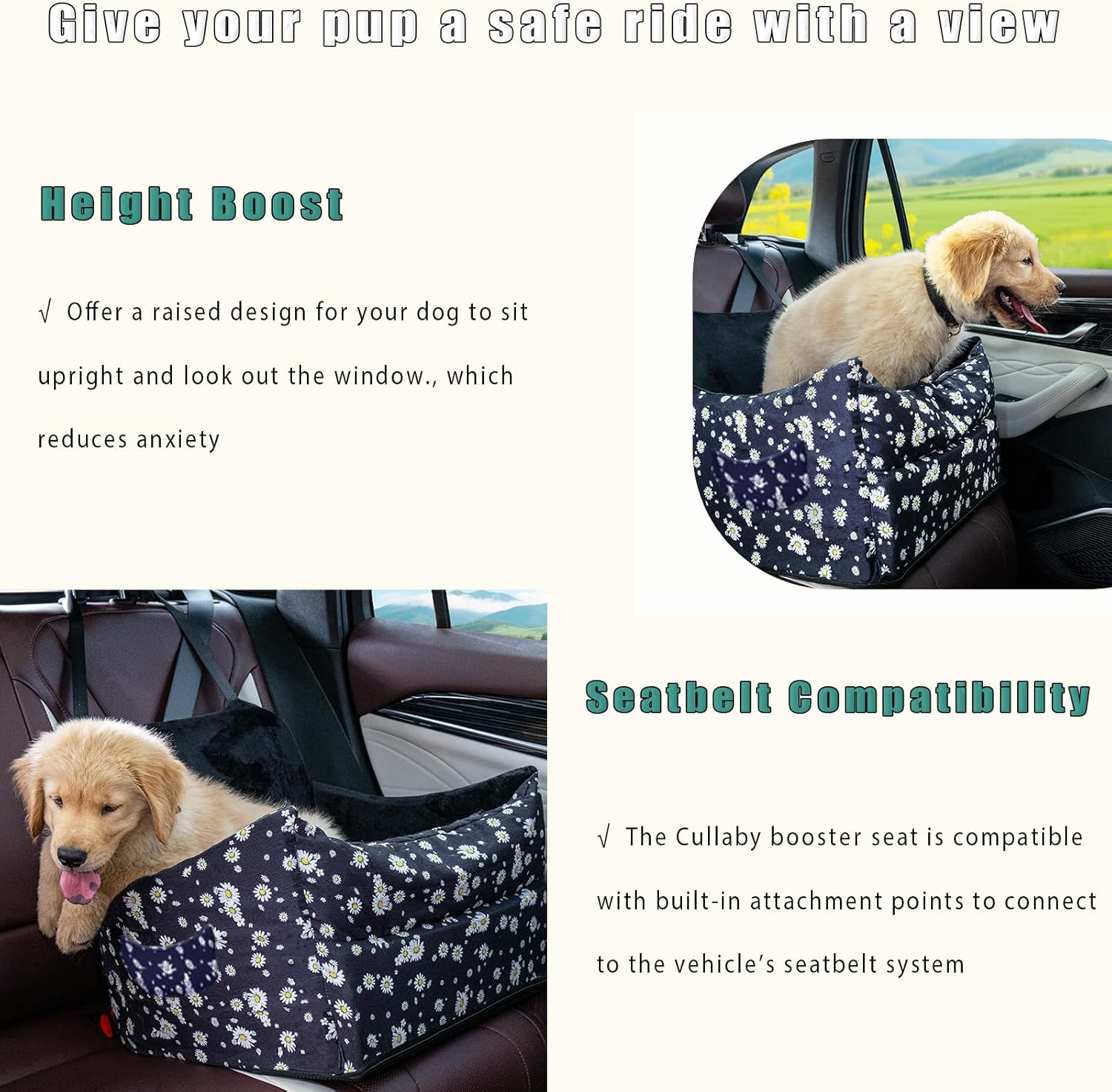 About this item Dog Booster Car Seat: Elevated 4-inch Pad, this pet booster lets your pup soak in the view—cutting down on car anxiety in the process. Whether it’s a quick vet run or a long road trip, they’ll ride comfy, calm, and content. Size & Fit: Measure your pup’s height, length, and weight for a snug, comfy fit—no cramping. Supports up to 25 lbs; check it works for your dog’s safety. Secure Attachment: Built-in adjustable safety belts secure your dog’s harness. Strong straps and buckles lock the seat tight to your car seat, preventing shifts during sudden stops or turns—keeping your pet safe and comfy the whole ride Comfort: Plush padding keeps your pup cozy mile after mile. Plus, the removable, washable cover makes keeping it fresh a breeze. 【Easy Install & Maintenance】: Setting up this dog booster seat is a cinch. Just thread your car’s seatbelt through the bottom slots, secure the top strap to the headrest, adjust for a snug fit, and you’re good to go. Plus, the removable cover unzips easily—easy to wash, so the seat stays fresh for every ride. Additional Considerations: Ease your pup into it—introduce the seat at home first, with treats and praise to make it a happy space. Bonus: It doubles as a cozy bed indoors, adding extra value. › See more product details