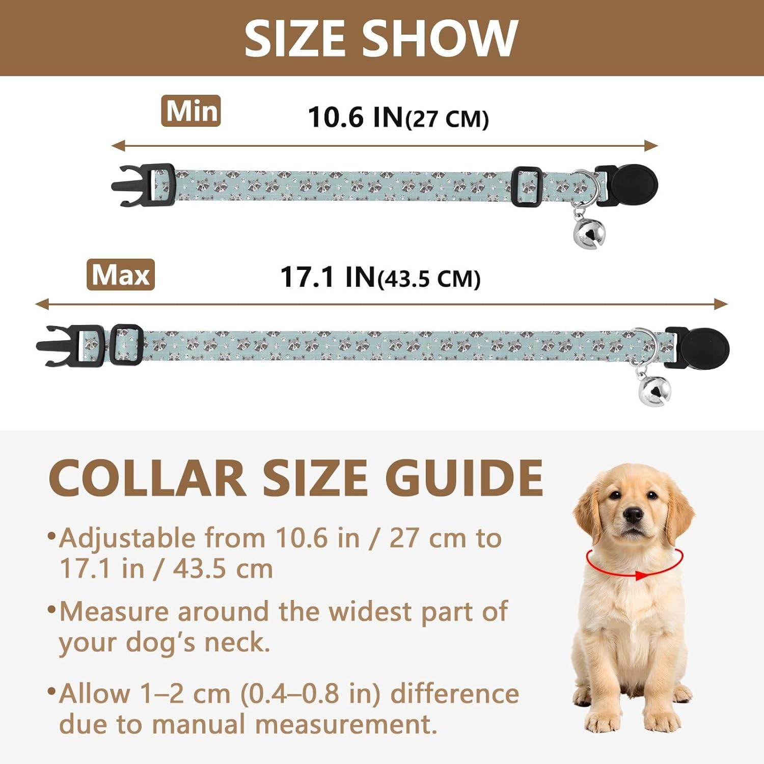 About Our Pet Collar: Suitable for Cats & Small Dogs Designed for cats and small dog, this pet collar works well for daily wear, indoor activities, and outdoor walks. Materials -- Made from polyester webbing that feels smooth on the skin and maintains a neat appearance. -- Double-sided printed design stays flexible and comfortable without causing rubbing. -- Includes an adjustable buckle and a metal bell for added functionality. Adjustable Fit -- Adjustable dog collar fits neck sizes from 10.6 to 17.1 inches. -- Easy-to-use buckle allows quick size changes as pets grow. -- Stays properly positioned during movement and play. Bell Design -- Built-in metal bell produces a soft sound for easy pet tracking indoors. -- Adds a decorative touch while supporting daily use as a cat collar or dog collar. Package Included -- 2 × Pet Collars -- Width: 0.6 in each -- Suitable for rotation, cleaning, or multi-pet households. HN005Care Instructions -- Hand wash recommended