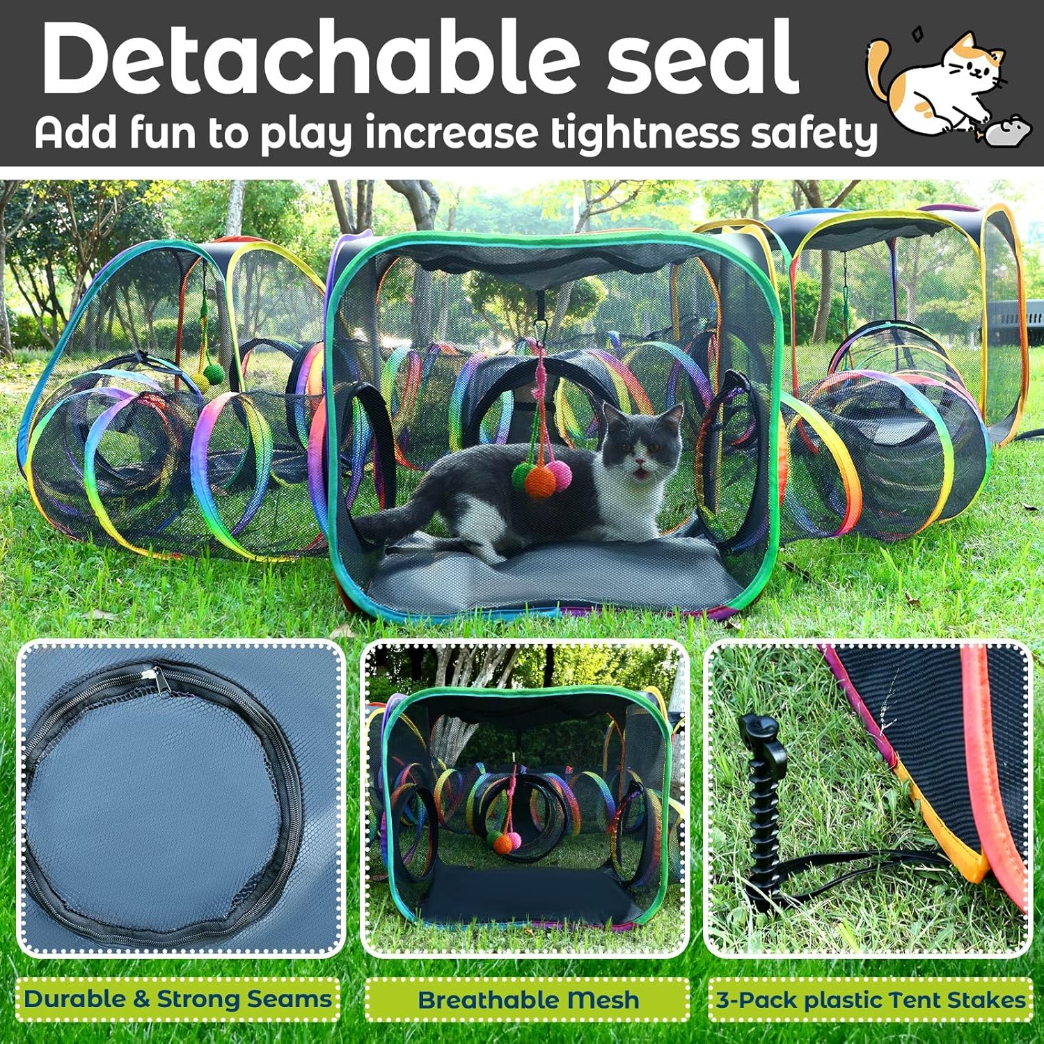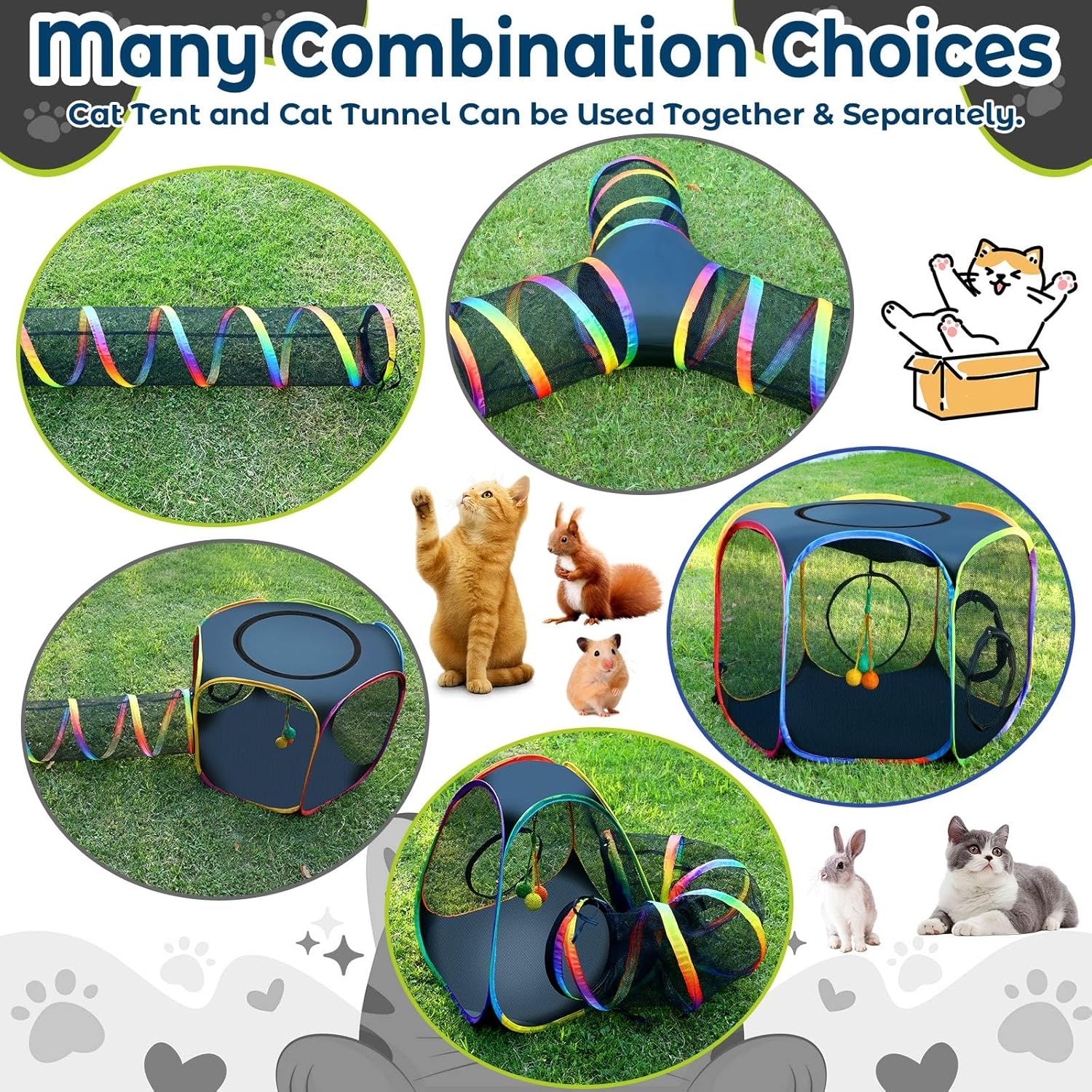 About this item ๐ 7-in-1 Cat Enclosures for Small Cats: Give your cat (or other small friend) the ultimate playland! This all-in-one set features 3 uniquely shaped tents (Hexagon: 32" x 32" x 20", Square & Triangle: 24" x 24" x 20"), 3 straight tunnels (51" long), and 1 curved cat tunnel (26" long)โplus 3 hanging scratch balls for extra fun. Connect them your way to create the purrfect playground for chasing, napping, and hide-and-seek! ๐พ Designed for Curiosity & Exercise: Specially scaled for smaller cats and animals like rabbits and ferrets! Wide entrances and cozy interiors let your cat stalk, pounce, and zoom just like nature intended! With multiple shapes and connection options, this setup sparks natural instincts, fights boredom, and keeps them movingโideal for one cat or a whole furry crew ๐จ Stay Cool, Play Hard: Made with tough Oxford fabric and breathable mesh panels, our cat tent with tunnels stays extra ventilatedโso even on warm days, your pet stays comfy and safe during indoor or outdoor adventures. Perfect for the yard, patio, or living room! ๐งณ Folds Flat. Goes Anywhere: Set up and pack away in seconds! Your pop-up catio folds compactly to store under furniture or inside the included carry bag. Lightweight and portable, itโs the perfect take-along comfort zone for travel, vet visits, or visiting friends ๐ Room for the Whole Crew (And Their Stuff!): With over 30 sq. ft. of interconnected play space, this cat playpen provides plenty of room for multiple small cats or other petite pets. You can even fit litter boxes, toys, and water bowls inside, creating a perfect area for a full day of fun and relaxation โบ See more product details