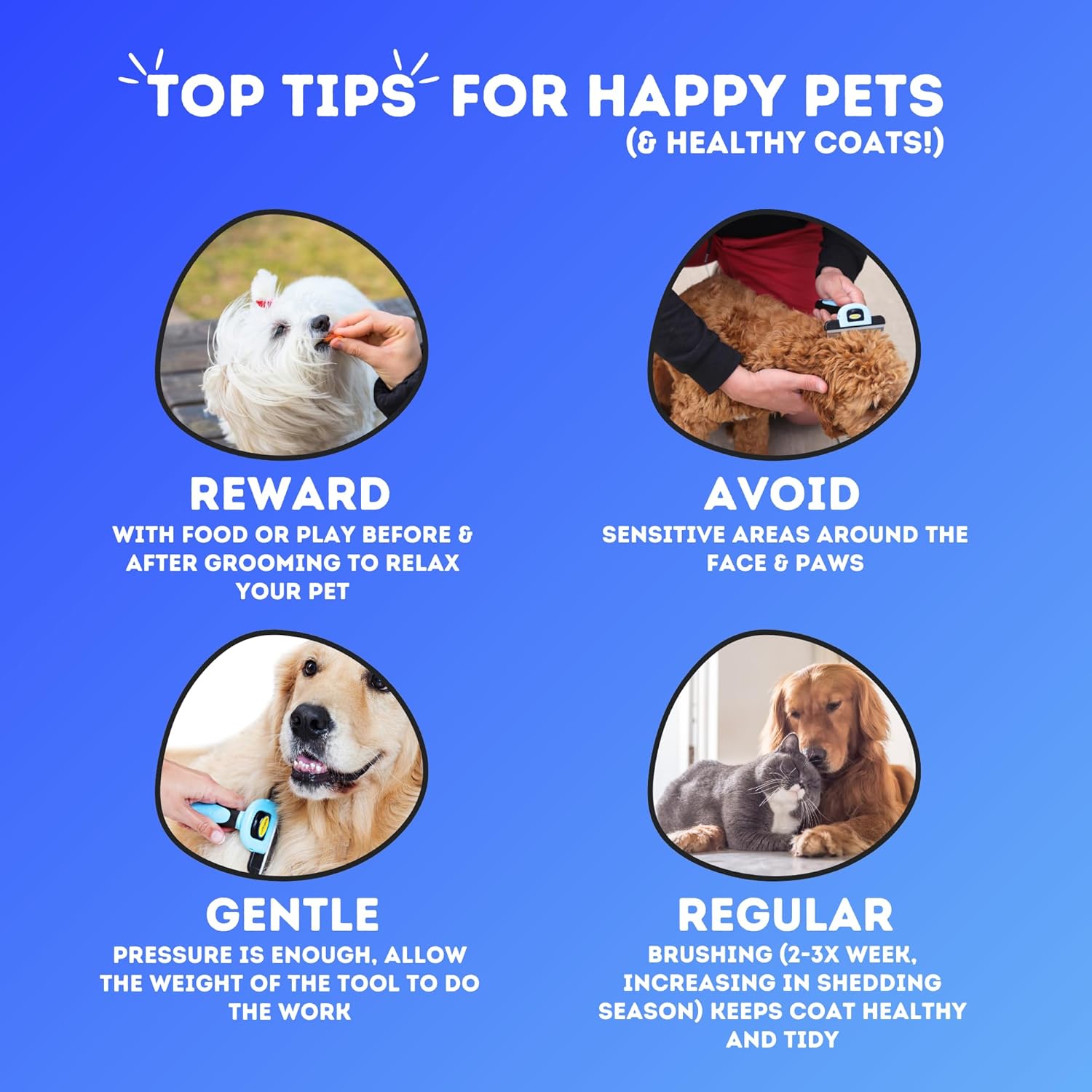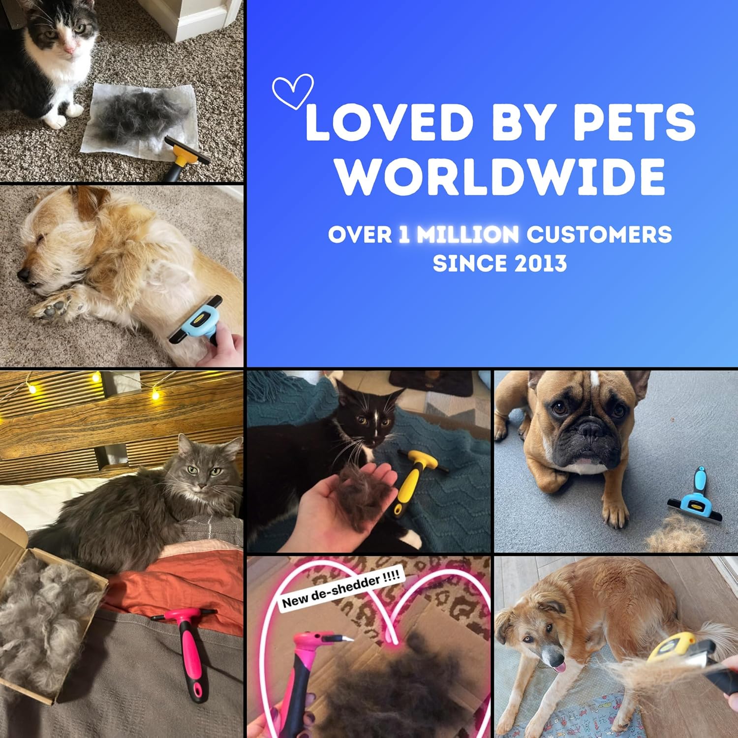 About this item OVER A MILLION UNITS SOLD WORLDWIDE! Trusted by countless happy customers to keep their furry friends looking and feeling their best. DakPets cat and dog deshedding brush gently yet firmly removes trapped hair, reducing shedding by up to 95% in just 10 minutes. Our 4-inch cat and dog hair remover can be used on short and long-haired dogs and cats of any size, making it a convenient solution for all your pets. MULTIPLE BENEFITS: Our dog and cat brush for shedding removes loose hairs and lightly thins the coat without causing discomfort. This improves the health and appearance of your pet's coat, relieves stress, stimulates blood circulation, and helps you to keep your home fur-free too! ROBUST: DakPets cat and dog grooming brush features a strong, shatterproof handle and rust-resistant stainless steel blade. It also comes with a handy protective blade cover. This makes our dog hair brush and cat fur remover highly durable, so you can be sure it won't let you down when you need it. USER-FRIENDLY: This easy-grip deshedding tool for dogs and cats has a versatile detachable design that allows you to remove the comb at just the press of a button. This allows for easy cleaning, and the detached pet fur remover comb can even be used on its own for hard-to-reach areas. RECOMMENDED BY VETS: All DakPets’ deshedding brush for cats and dogs are approved by professional veterinarians and rigorously tested to ensure they meet the highest animal safety standards - meaning you can be sure of giving your pet the very best care with our cat and dog brushes for shedding. › See more product details